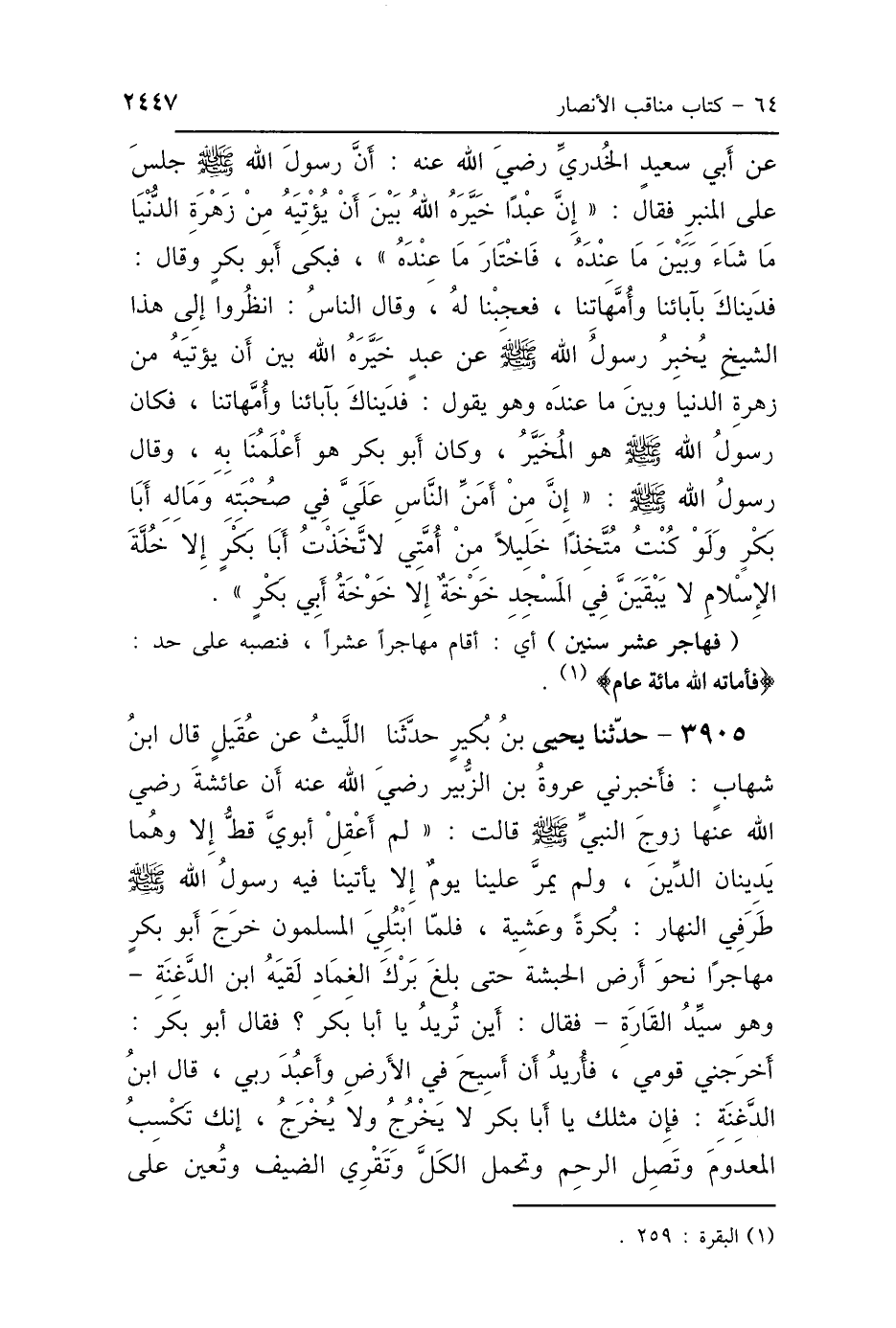 عَنْ أَبِي سَعِيدٍ الخُدْرِيِّ رَضِيَ اللَّهُ عَنْهُ، أَنَّ رَسُولَ اللَّهِ صَلَّى اللهُ عَلَيْهِ وَسَلَّمَ جَلَسَ عَلَى المِنْبَرِ فَقَالَ: «إِنَّ عَبْدًا خَيَّرَهُ اللَّهُ بَيْنَ أَنْ يُؤْتِيَهُ مِنْ زَهْرَةِ الدُّنْيَا مَا شَاءَ، وَبَيْنَ مَا عِنْدَهُ، فَاخْتَارَ مَا عِنْدَهُ» فَبَكَى أَبُو بَكْرٍ وَقَالَ: فَدَيْنَاكَ بِآبَائِنَا وَأُمَّهَاتِنَا، فَعَجِبْنَا لَهُ، وَقَالَ النَّاسُ: انْظُرُوا إِلَى هَذَا الشَّيْخِ، يُخْبِرُ رَسُولُ اللَّهِ صَلَّى اللهُ عَلَيْهِ وَسَلَّمَ عَنْ عَبْدٍ خَيَّرَهُ اللَّهُ بَيْنَ أَنْ يُؤْتِيَهُ مِنْ زَهْرَةِ الدُّنْيَا، وَبَيْنَ مَا عِنْدَهُ، وَهُوَ يَقُولُ: فَدَيْنَاكَ بِآبَائِنَا وَأُمَّهَاتِنَا، فَكَانَ رَسُولُ اللَّهِ صَلَّى اللهُ عَلَيْهِ وَسَلَّمَ هُوَ المُخَيَّرَ، وَكَانَ أَبُو بَكْرٍ هُوَ أَعْلَمَنَا بِهِ، وَقَالَ رَسُولُ اللَّهِ صَلَّى اللهُ عَلَيْهِ وَسَلَّمَ: «إِنَّ مِنْ أَمَنِّ النَّاسِ عَلَيَّ فِي صُحْبَتِهِ وَمَالِهِ أَبَا بَكْرٍ، وَلَوْ كُنْتُ مُتَّخِذًا خَلِيلًا مِنْ أُمَّتِي لاَتَّخَذْتُ أَبَا بَكْرٍ، إِلَّا خُلَّةَ الإِسْلاَمِ، لاَ يَبْقَيَنَّ فِي المَسْجِدِ خَوْخَةٌ إِلَّا خَوْخَةُ أَبِي بَكْرٍ».