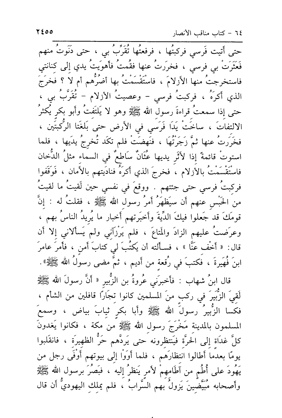 قَالَ ابْنُ شِهَابٍ، فَأَخْبَرَنِي عُرْوَةُ بْنُ الزُّبَيْرِ، أَنَّ رَسُولَ اللَّهِ صَلَّى اللهُ عَلَيْهِ وَسَلَّمَ لَقِيَ الزُّبَيْرَ فِي رَكْبٍ مِنَ المُسْلِمِينَ، كَانُوا تِجَارًا قَافِلِينَ مِنَ الشَّأْمِ، فَكَسَا الزُّبَيْرُ رَسُولَ اللَّهِ صَلَّى اللهُ عَلَيْهِ وَسَلَّمَ وَأَبَا بَكْرٍ ثِيَابَ بَيَاضٍ، وَسَمِعَ المُسْلِمُونَ بِالْمَدِينَةِ مَخْرَجَ رَسُولِ اللَّهِ صَلَّى اللهُ عَلَيْهِ وَسَلَّمَ مِنْ مَكَّةَ، فَكَانُوا يَغْدُونَ كُلَّ غَدَاةٍ إِلَى الحَرَّةِ، فَيَنْتَظِرُونَهُ حَتَّى يَرُدَّهُمْ حَرُّ الظَّهِيرَةِ، فَانْقَلَبُوا يَوْمًا بَعْدَ مَا أَطَالُوا انْتِظَارَهُمْ، فَلَمَّا أَوَوْا إِلَى بُيُوتِهِمْ، أَوْفَى رَجُلٌ مِنْ يَهُودَ عَلَى أُطُمٍ مِنْ آطَامِهِمْ، لِأَمْرٍ يَنْظُرُ إِلَيْهِ، فَبَصُرَ بِرَسُولِ اللَّهِ صَلَّى اللهُ عَلَيْهِ وَسَلَّمَ وَأَصْحَابِهِ مُبَيَّضِينَ يَزُولُ بِهِمُ السَّرَابُ، فَلَمْ يَمْلِكِ اليَهُودِيُّ أَنْ قَالَ