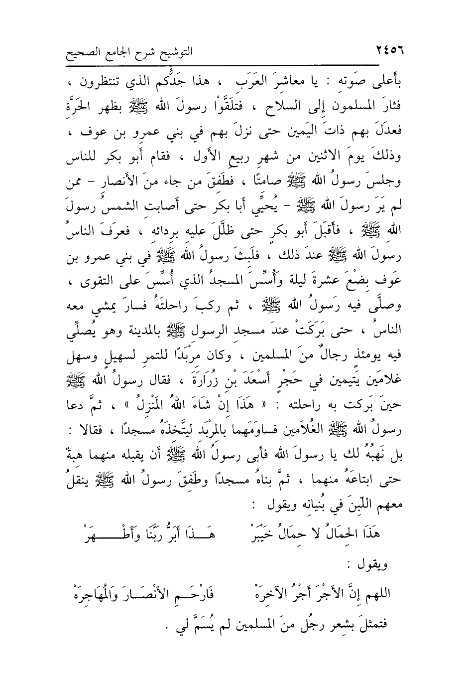 بِأَعْلَى صَوْتِهِ: يَا مَعَاشِرَ العَرَبِ، هَذَا جَدُّكُمُ الَّذِي تَنْتَظِرُونَ، فَثَارَ المُسْلِمُونَ إِلَى السِّلاَحِ، فَتَلَقَّوْا رَسُولَ اللَّهِ صَلَّى اللهُ عَلَيْهِ وَسَلَّمَ بِظَهْرِ الحَرَّةِ، فَعَدَلَ بِهِمْ ذَاتَ اليَمِينِ، حَتَّى نَزَلَ بِهِمْ فِي بَنِي عَمْرِو بْنِ عَوْفٍ، وَذَلِكَ يَوْمَ الِاثْنَيْنِ مِنْ شَهْرِ رَبِيعٍ الأَوَّلِ، فَقَامَ أَبُو بَكْرٍ لِلنَّاسِ، وَجَلَسَ رَسُولُ اللَّهِ صَلَّى اللهُ عَلَيْهِ وَسَلَّمَ صَامِتًا، فَطَفِقَ مَنْ جَاءَ مِنَ الأَنْصَارِ - مِمَّنْ لَمْ يَرَ رَسُولَ اللَّهِ صَلَّى اللهُ عَلَيْهِ وَسَلَّمَ - يُحَيِّي أَبَا بَكْرٍ، حَتَّى أَصَابَتِ الشَّمْسُ رَسُولَ اللَّهِ صَلَّى اللهُ عَلَيْهِ وَسَلَّمَ، فَأَقْبَلَ أَبُو بَكْرٍ حَتَّى ظَلَّلَ عَلَيْهِ بِرِدَائِهِ، فَعَرَفَ النَّاسُ رَسُولَ اللَّهِ صَلَّى اللهُ عَلَيْهِ وَسَلَّمَ عِنْدَ ذَلِكَ، فَلَبِثَ رَسُولُ اللَّهِ صَلَّى اللهُ عَلَيْهِ وَسَلَّمَ فِي بَنِي عَمْرِو بْنِ عَوْفٍ بِضْعَ عَشْرَةَ لَيْلَةً، وَأُسِّسَ المَسْجِدُ الَّذِي أُسِّسَ عَلَى التَّقْوَى، وَصَلَّى فِيهِ رَسُولُ اللَّهِ صَلَّى اللهُ عَلَيْهِ وَسَلَّمَ، ثُمَّ رَكِبَ رَاحِلَتَهُ، فَسَارَ يَمْشِي مَعَهُ النَّاسُ حَتَّى بَرَكَتْ عِنْدَ مَسْجِدِ الرَّسُولِ صَلَّى اللهُ عَلَيْهِ وَسَلَّمَ بِالْمَدِينَةِ، وَهُوَ يُصَلِّي فِيهِ يَوْمَئِذٍ رِجَالٌ مِنَ المُسْلِمِينَ، وَكَانَ مِرْبَدًا لِلتَّمْرِ، لِسُهَيْلٍ وَسَهْلٍ غُلاَمَيْنِ يَتِيمَيْنِ فِي حَجْرِ أَسْعَدَ بْنِ زُرَارَةَ، فَقَالَ رَسُولُ اللَّهِ صَلَّى اللهُ عَلَيْهِ وَسَلَّمَ حِينَ بَرَكَتْ بِهِ رَاحِلَتُهُ: «هَذَا إِنْ شَاءَ اللَّهُ المَنْزِلُ». ثُمَّ دَعَا رَسُولُ اللَّهِ صَلَّى اللهُ عَلَيْهِ وَسَلَّمَ الغُلاَمَيْنِ فَسَاوَمَهُمَا بِالْمِرْبَدِ، لِيَتَّخِذَهُ مَسْجِدًا، فَقَالاَ: لاَ، بَلْ نَهَبُهُ لَكَ يَا رَسُولَ اللَّهِ، فَأَبَى رَسُولُ اللَّهِ أَنْ يَقْبَلَهُ مِنْهُمَا هِبَةً حَتَّى ابْتَاعَهُ مِنْهُمَا، ثُمَّ بَنَاهُ مَسْجِدًا، وَطَفِقَ رَسُولُ اللَّهِ صَلَّى اللهُ عَلَيْهِ وَسَلَّمَ يَنْقُلُ مَعَهُمُ اللَّبِنَ فِي بُنْيَانِهِ وَيَقُولُ، وَهُوَ يَنْقُلُ اللَّبِنَ: " هَذَا الحِمَالُ لاَ حِمَالَ خَيْبَرْ، هَذَا أَبَرُّ رَبَّنَا وَأَطْهَرْ، وَيَقُولُ: اللَّهُمَّ إِنَّ الأَجْرَ أَجْرُ الآخِرَهْ، فَارْحَمِ الأَنْصَارَ، وَالمُهَاجِرَهْ " فَتَمَثَّلَ بِشِعْرِ رَجُلٍ مِنَ المُسْلِمِينَ لَمْ يُسَمَّ لِي.