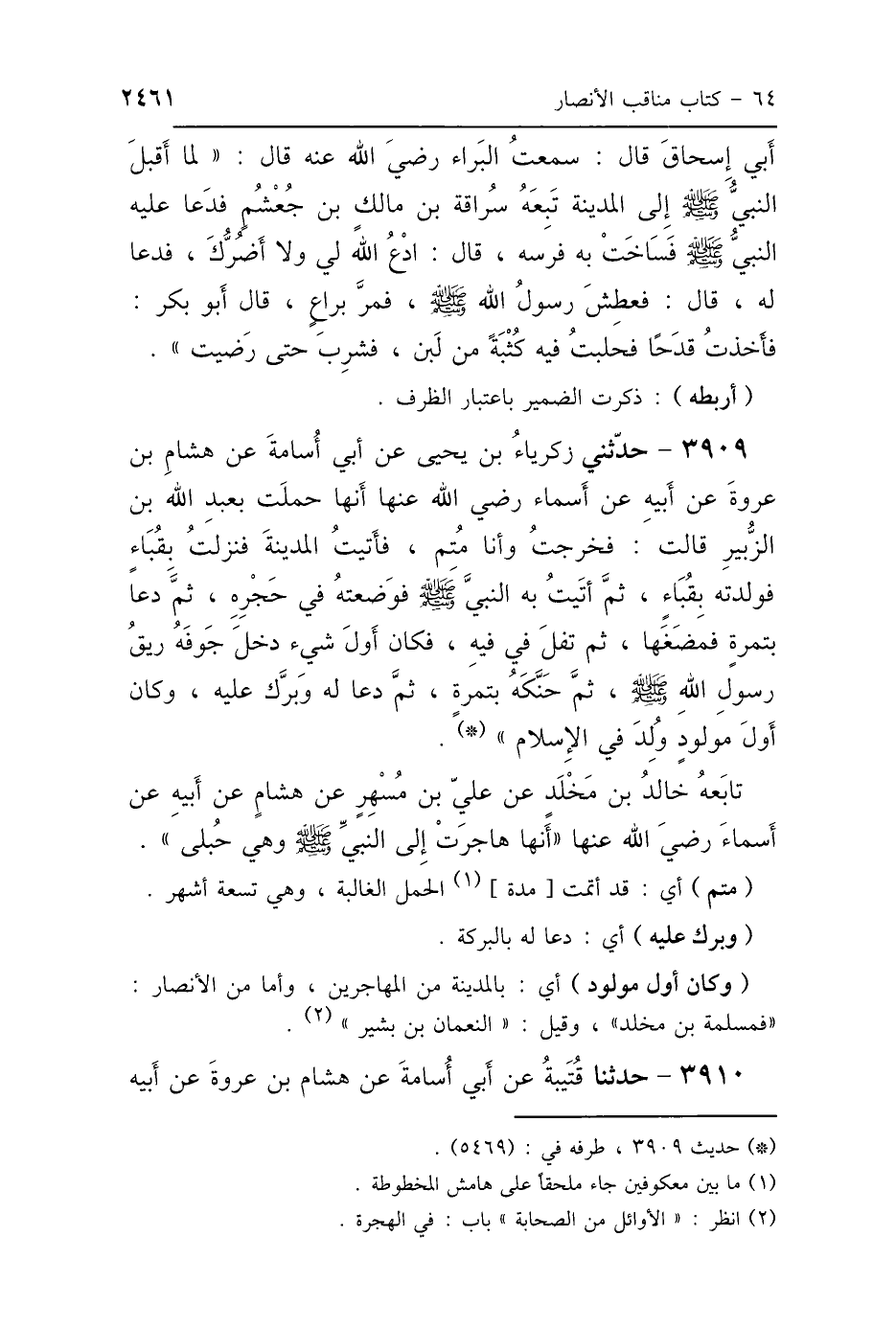 3909 - حَدَّثَنِي زَكَرِيَّاءُ بْنُ يَحْيَى، عَنْ أَبِي أُسَامَةَ، عَنْ هِشَامِ بْنِ عُرْوَةَ، عَنْ أَبِيهِ، عَنْ أَسْمَاءَ رَضِيَ اللَّهُ عَنْهَا: أَنَّهَا حَمَلَتْ بِعَبْدِ اللَّهِ بْنِ الزُّبَيْرِ، قَالَتْ: فَخَرَجْتُ وَأَنَا مُتِمٌّ فَأَتَيْتُ المَدِينَةَ فَنَزَلْتُ بِقُبَاءٍ فَوَلَدْتُهُ بِقُبَاءٍ، ثُمَّ أَتَيْتُ بِهِ النَّبِيَّ صَلَّى اللهُ عَلَيْهِ وَسَلَّمَ فَوَضَعْتُهُ فِي حَجْرِهِ، ثُمَّ «دَعَا بِتَمْرَةٍ فَمَضَغَهَا، ثُمَّ تَفَلَ فِي فِيهِ، فَكَانَ أَوَّلَ شَيْءٍ دَخَلَ جَوْفَهُ رِيقُ رَسُولِ اللَّهِ صَلَّى اللهُ عَلَيْهِ وَسَلَّمَ، ثُمَّ حَنَّكَهُ بِتَمْرَةٍ ثُمَّ دَعَا لَهُ، وَبَرَّكَ عَلَيْهِ وَكَانَ أَوَّلَ مَوْلُودٍ وُلِدَ فِي الإِسْلاَمِ» تَابَعَهُ خَالِدُ بْنُ مَخْلَدٍ، عَنْ عَلِيِّ بْنِ مُسْهِرٍ، عَنْ هِشَامٍ، عَنْ أَبِيهِ، عَنْ أَسْمَاءَ رَضِيَ اللَّهُ عَنْهَا، أَنَّهَا هَاجَرَتْ إِلَى النَّبِيِّ صَلَّى اللهُ عَلَيْهِ وَسَلَّمَ وَهِيَ حُبْلَى.