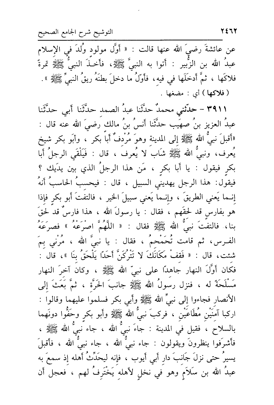 3911 - حَدَّثَنِي مُحَمَّدٌ، حَدَّثَنَا عَبْدُ الصَّمَدِ، حَدَّثَنَا أَبِي، حَدَّثَنَا عَبْدُ العَزِيزِ بْنُ صُهَيْبٍ، حَدَّثَنَا أَنَسُ بْنُ مَالِكٍ رَضِيَ اللَّهُ عَنْهُ، قَالَ: أَقْبَلَ نَبِيُّ اللَّهِ صَلَّى اللهُ عَلَيْهِ وَسَلَّمَ إِلَى المَدِينَةِ وَهُوَ مُرْدِفٌ أَبَا بَكْرٍ، وَأَبُو بَكْرٍ شَيْخٌ يُعْرَفُ، وَنَبِيُّ اللَّهِ صَلَّى اللهُ عَلَيْهِ وَسَلَّمَ شَابٌّ لاَ يُعْرَفُ، قَالَ: فَيَلْقَى الرَّجُلُ أَبَا بَكْرٍ فَيَقُولُ يَا أَبَا بَكْرٍ مَنْ هَذَا الرَّجُلُ الَّذِي بَيْنَ يَدَيْكَ؟ فَيَقُولُ: هَذَا الرَّجُلُ يَهْدِينِي السَّبِيلَ، قَالَ: فَيَحْسِبُ الحَاسِبُ أَنَّهُ إِنَّمَا يَعْنِي الطَّرِيقَ، وَإِنَّمَا يَعْنِي سَبِيلَ الخَيْرِ، فَالْتَفَتَ أَبُو بَكْرٍ فَإِذَا هُوَ بِفَارِسٍ قَدْ لَحِقَهُمْ، فَقَالَ: يَا رَسُولَ اللَّهِ، هَذَا فَارِسٌ قَدْ لَحِقَ بِنَا، فَالْتَفَتَ نَبِيُّ اللَّهِ صَلَّى اللهُ عَلَيْهِ وَسَلَّمَ، فَقَالَ: «اللَّهُمَّ اصْرَعْهُ». فَصَرَعَهُ الفَرَسُ، ثُمَّ قَامَتْ تُحَمْحِمُ، فَقَالَ: يَا نَبِيَّ اللَّهِ، مُرْنِي بِمَا شِئْتَ، قَالَ: «فَقِفْ مَكَانَكَ، لاَ تَتْرُكَنَّ أَحَدًا يَلْحَقُ بِنَا». قَالَ: " فَكَانَ أَوَّلَ النَّهَارِ جَاهِدًا عَلَى نَبِيِّ اللَّهِ صَلَّى اللهُ عَلَيْهِ وَسَلَّمَ، وَكَانَ آخِرَ النَّهَارِ مَسْلَحَةً لَهُ، فَنَزَلَ رَسُولُ اللَّهِ صَلَّى اللهُ عَلَيْهِ وَسَلَّمَ جَانِبَ الحَرَّةِ، ثُمَّ بَعَثَ إِلَى الأَنْصَارِ فَجَاءُوا إِلَى نَبِيِّ اللَّهِ صَلَّى اللهُ عَلَيْهِ وَسَلَّمَ وَأَبِي بَكْرٍ فَسَلَّمُوا عَلَيْهِمَا، وَقَالُوا: ارْكَبَا آمِنَيْنِ مُطَاعَيْنِ. فَرَكِبَ نَبِيُّ اللَّهِ صَلَّى اللهُ عَلَيْهِ وَسَلَّمَ وَأَبُو بَكْرٍ، وَحَفُّوا دُونَهُمَا بِالسِّلاَحِ، فَقِيلَ فِي المَدِينَةِ: جَاءَ نَبِيُّ اللَّهِ، جَاءَ نَبِيُّ اللَّهِ صَلَّى اللهُ عَلَيْهِ وَسَلَّمَ، فَأَشْرَفُوا يَنْظُرُونَ وَيَقُولُونَ: جَاءَ نَبِيُّ اللَّهِ، جَاءَ نَبِيُّ اللَّهِ، فَأَقْبَلَ يَسِيرُ حَتَّى نَزَلَ جَانِبَ دَارِ أَبِي أَيُّوبَ، فَإِنَّهُ لَيُحَدِّثُ أَهْلَهُ إِذْ سَمِعَ بِهِ عَبْدُ اللَّهِ بْنُ سَلاَمٍ، وَهُوَ فِي نَخْلٍ لِأَهْلِهِ، يَخْتَرِفُ لَهُمْ، فَعَجِلَ أَنْ
