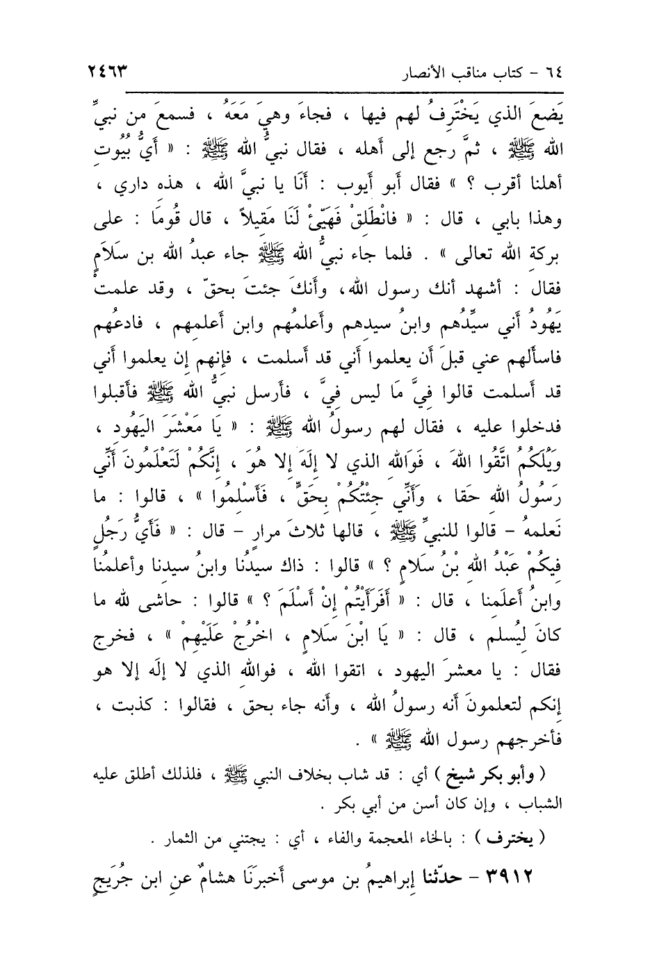 يَضَعَ الَّذِي يَخْتَرِفُ لَهُمْ فِيهَا، فَجَاءَ وَهِيَ مَعَهُ، فَسَمِعَ مِنْ نَبِيِّ اللَّهِ صَلَّى اللهُ عَلَيْهِ وَسَلَّمَ، ثُمَّ رَجَعَ إِلَى أَهْلِهِ، فَقَالَ نَبِيُّ اللَّهِ صَلَّى اللهُ عَلَيْهِ وَسَلَّمَ: «أَيُّ بُيُوتِ أَهْلِنَا أَقْرَبُ». فَقَالَ أَبُو أَيُّوبَ: أَنَا يَا نَبِيَّ اللَّهِ، هَذِهِ دَارِي وَهَذَا بَابِي، قَالَ: «فَانْطَلِقْ فَهَيِّئْ لَنَا مَقِيلًا»، قَالَ: قُومَا عَلَى بَرَكَةِ اللَّهِ، فَلَمَّا جَاءَ نَبِيُّ اللَّهِ صَلَّى اللهُ عَلَيْهِ وَسَلَّمَ جَاءَ عَبْدُ اللَّهِ بْنُ سَلاَمٍ فَقَالَ: أَشْهَدُ أَنَّكَ رَسُولُ اللَّهِ، وَأَنَّكَ جِئْتَ بِحَقٍّ، وَقَدْ عَلِمَتْ يَهُودُ أَنِّي سَيِّدُهُمْ وَابْنُ سَيِّدِهِمْ، وَأَعْلَمُهُمْ وَابْنُ أَعْلَمِهِمْ، فَادْعُهُمْ فَاسْأَلْهُمْ عَنِّي قَبْلَ أَنْ يَعْلَمُوا أَنِّي قَدْ أَسْلَمْتُ، فَإِنَّهُمْ إِنْ يَعْلَمُوا أَنِّي قَدْ أَسْلَمْتُ قَالُوا فِيَّ مَا لَيْسَ فِيَّ. فَأَرْسَلَ نَبِيُّ اللَّهِ صَلَّى اللهُ عَلَيْهِ وَسَلَّمَ فَأَقْبَلُوا فَدَخَلُوا عَلَيْهِ، فَقَالَ لَهُمْ رَسُولُ اللَّهِ صَلَّى اللهُ عَلَيْهِ وَسَلَّمَ: «يَا مَعْشَرَ اليَهُودِ، وَيْلَكُمْ، اتَّقُوا اللَّهَ، فَوَاللَّهِ الَّذِي لاَ إِلَهَ إِلَّا هُوَ، إِنَّكُمْ لَتَعْلَمُونَ أَنِّي رَسُولُ اللَّهِ حَقًّا، وَأَنِّي جِئْتُكُمْ بِحَقٍّ، فَأَسْلِمُوا»، قَالُوا: مَا نَعْلَمُهُ، قَالُوا لِلنَّبِيِّ صَلَّى اللهُ عَلَيْهِ وَسَلَّمَ، قَالَهَا ثَلاَثَ مِرَارٍ، قَالَ: «فَأَيُّ رَجُلٍ فِيكُمْ عَبْدُ اللَّهِ بْنُ سَلاَمٍ؟» قَالُوا: ذَاكَ سَيِّدُنَا وَابْنُ سَيِّدِنَا، وَأَعْلَمُنَا وَابْنُ أَعْلَمِنَا، قَالَ: «أَفَرَأَيْتُمْ إِنْ أَسْلَمَ؟»، قَالُوا: حَاشَى لِلَّهِ مَا كَانَ لِيُسْلِمَ، قَالَ: «أَفَرَأَيْتُمْ إِنْ أَسْلَمَ؟» قَالُوا: حَاشَى لِلَّهِ مَا كَانَ لِيُسْلِمَ، قَالَ: «أَفَرَأَيْتُمْ إِنْ أَسْلَمَ؟»، قَالُوا: حَاشَى لِلَّهِ مَا كَانَ لِيُسْلِمَ، قَالَ: «يَا ابْنَ سَلاَمٍ اخْرُجْ عَلَيْهِمْ»، فَخَرَجَ فَقَالَ: يَا مَعْشَرَ اليَهُودِ اتَّقُوا اللَّهَ، فَوَاللَّهِ الَّذِي لاَ إِلَهَ إِلَّا هُوَ، إِنَّكُمْ لَتَعْلَمُونَ أَنَّهُ رَسُولُ اللَّهِ، وَأَنَّهُ جَاءَ بِحَقٍّ، فَقَالُوا: كَذَبْتَ، فَأَخْرَجَهُمْ رَسُولُ اللَّهِ صَلَّى اللهُ عَلَيْهِ وَسَلَّمَ.