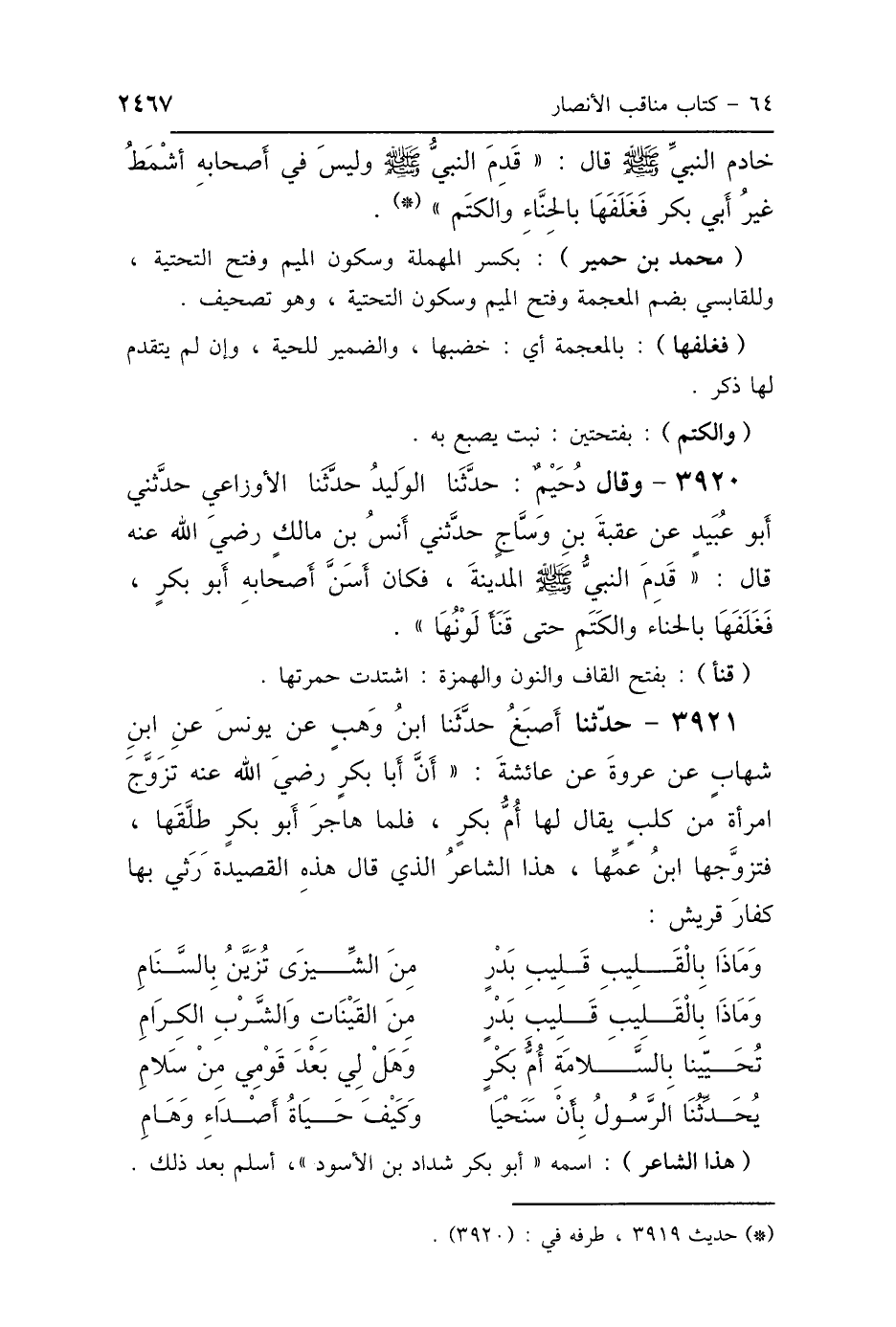 3920 - وَقَالَ: دُحَيْمٌ، حَدَّثَنَا الوَلِيدُ، حَدَّثَنَا الأَوْزَاعِيُّ، حَدَّثَنِي أَبُو عُبَيْدٍ، عَنْ عُقْبَةَ بْنِ وَسَّاجٍ، حَدَّثَنِي أَنَسُ بْنُ مَالِكٍ رَضِيَ اللَّهُ عَنْهُ، قَالَ: «قَدِمَ النَّبِيُّ صَلَّى اللهُ عَلَيْهِ وَسَلَّمَ المَدِينَةَ فَكَانَ أَسَنَّ أَصْحَابِهِ أَبُو بَكْرٍ، فَغَلَفَهَا بِالحِنَّاءِ وَالكَتَمِ حَتَّى قَنَأَ لَوْنُهَا».