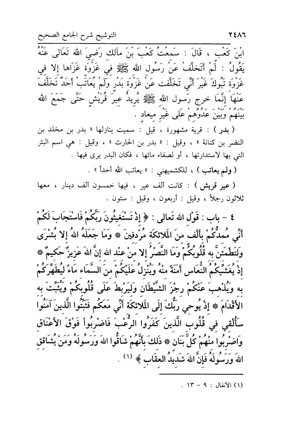 4 - بَابُ قَوْلِ اللَّهِ تَعَالَى {إِذْ تَسْتَغِيثُونَ رَبَّكُمْ فَاسْتَجَابَ لَكُمْ أَنِّي مُمِدُّكُمْ بِأَلْفٍ مِنَ المَلاَئِكَةِ مُرْدِفِينَ. وَمَا جَعَلَهُ اللَّهُ إِلَّا بُشْرَى وَلِتَطْمَئِنَّ بِهِ قُلُوبُكُمْ وَمَا النَّصْرُ إِلَّا مِنْ عِنْدِ اللَّهِ إِنَّ اللَّهَ عَزِيزٌ حَكِيمٌ. إِذْ يُغَشِّيكُمُ النُّعَاسَ أَمَنَةً مِنْهُ وَيُنَزِّلُ عَلَيْكُمْ مِنَ السَّمَاءِ مَاءً لِيُطَهِّرَكُمْ بِهِ وَيُذْهِبَ عَنْكُمْ رِجْزَ الشَّيْطَانِ وَلِيَرْبِطَ عَلَى قُلُوبِكُمْ وَيُثَبِّتَ بِهِ الأَقْدَامَ. إِذْ يُوحِي رَبُّكَ إِلَى المَلاَئِكَةِ أَنِّي مَعَكُمْ فَثَبِّتُوا الَّذِينَ آمَنُوا سَأُلْقِي فِي قُلُوبِ الَّذِينَ كَفَرُوا الرُّعْبَ فَاضْرِبُوا فَوْقَ الأَعْنَاقِ وَاضْرِبُوا مِنْهُمْ كُلَّ بَنَانٍ. ذَلِكَ بِأَنَّهُمْ شَاقُّوا اللَّهَ وَرَسُولَهُ وَمَنْ يُشَاقِقِ اللَّهَ وَرَسُولَهُ فَإِنَّ اللَّهَ شَدِيدُ العِقَابِ} [الأنفال: 10]