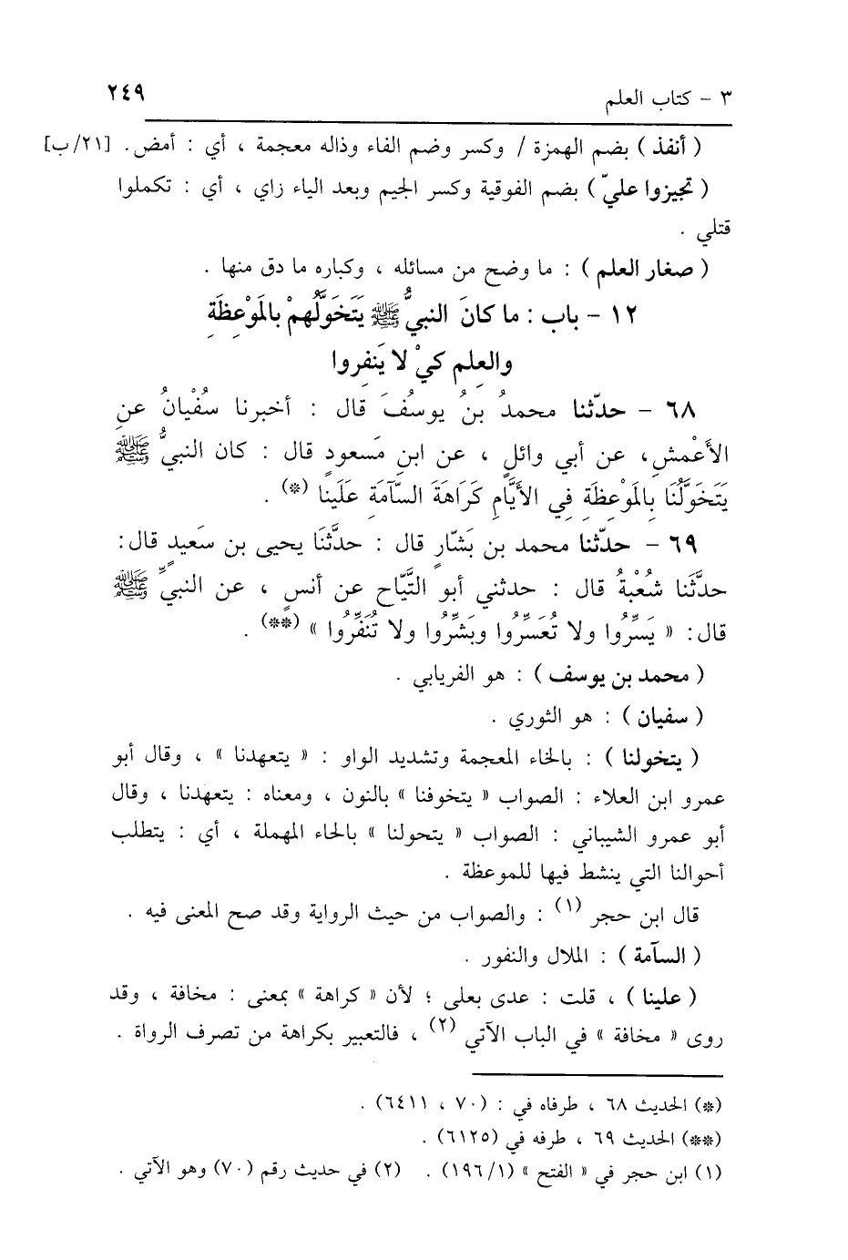 (يتخولنا): بالخاء العجمة وتشديد الواو: "يتعهدنا"، وقال أبو عمرو بن العلاء: الصواب "يتخوفنا" بالنون، ومعناه: يتعهدنا، وقال أبو عمرو الشيباني: الصواب "يتحولنا" بالحاء الهملة، أي: يتطلب أحوالنا التي ينشط فيها للموعظة.