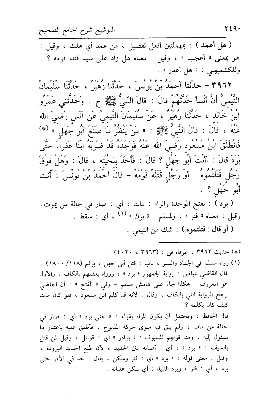 3962 - حَدَّثَنَا أَحْمَدُ بْنُ يُونُسَ، حَدَّثَنَا زُهَيْرٌ، حَدَّثَنَا سُلَيْمَانُ التَّيْمِيُّ، أَنَّ أَنَسًا، حَدَّثَهُمْ قَالَ: قَالَ النَّبِيُّ صَلَّى اللهُ عَلَيْهِ وَسَلَّمَ: ح وحَدَّثَنِي عَمْرُو بْنُ خَالِدٍ، حَدَّثَنَا زُهَيْرٌ، عَنْ سُلَيْمَانَ التَّيْمِيِّ، عَنْ أَنَسٍ رَضِيَ اللَّهُ عَنْهُ، قَالَ: قَالَ النَّبِيُّ صَلَّى اللهُ عَلَيْهِ وَسَلَّمَ: «مَنْ يَنْظُرُ مَا صَنَعَ أَبُو جَهْلٍ». فَانْطَلَقَ ابْنُ مَسْعُودٍ فَوَجَدَهُ قَدْ ضَرَبَهُ ابْنَا عَفْرَاءَ حَتَّى بَرَدَ، قَالَ: أَأَنْتَ، أَبُو جَهْلٍ؟ قَالَ: فَأَخَذَ بِلِحْيَتِهِ، قَالَ: وَهَلْ فَوْقَ رَجُلٍ قَتَلْتُمُوهُ، أَوْ رَجُلٍ قَتَلَهُ قَوْمُهُ قَالَ أَحْمَدُ بْنُ يُونُسَ: «أَنْتَ أَبُو جَهْلٍ».