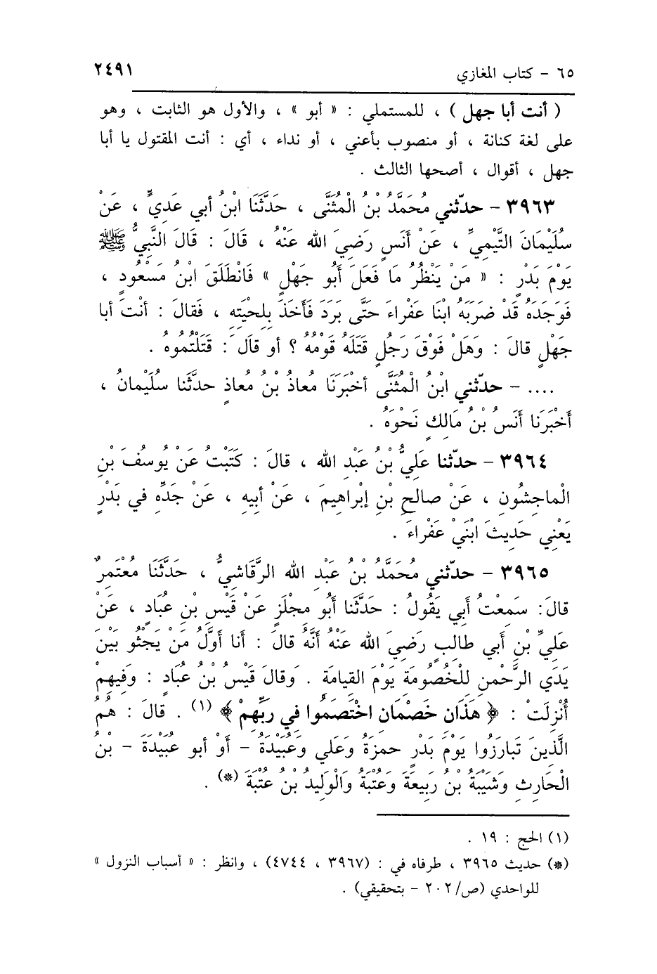 3965 - حَدَّثَنِي مُحَمَّدُ بْنُ عَبْدِ اللَّهِ الرَّقَاشِيُّ، حَدَّثَنَا مُعْتَمِرٌ، قَالَ: سَمِعْتُ أَبِي يَقُولُ: حَدَّثَنَا أَبُو مِجْلَزٍ، عَنْ قَيْسِ بْنِ عُبَادٍ، عَنْ عَلِيِّ بْنِ أَبِي طَالِبٍ رَضِيَ اللَّهُ عَنْهُ، أَنَّهُ قَالَ: «أَنَا أَوَّلُ مَنْ يَجْثُو بَيْنَ يَدَيِ الرَّحْمَنِ لِلْخُصُومَةِ يَوْمَ القِيَامَةِ» وَقَالَ قَيْسُ بْنُ عُبَادٍ: وَفِيهِمْ أُنْزِلَتْ: {هَذَانِ خَصْمَانِ اخْتَصَمُوا فِي رَبِّهِمْ} [الحج: 19] قَالَ: " هُمُ الَّذِينَ تَبَارَزُوا يَوْمَ بَدْرٍ: حَمْزَةُ، وَعَلِيٌّ، وَعُبَيْدَةُ، أَوْ أَبُو عُبَيْدَةَ بْنُ الحَارِثِ، وَشَيْبَةُ بْنُ رَبِيعَةَ، وَعُتْبَةُ بْنُ رَبِيعَةَ، وَالوَلِيدُ بْنُ عُتْبَةَ".