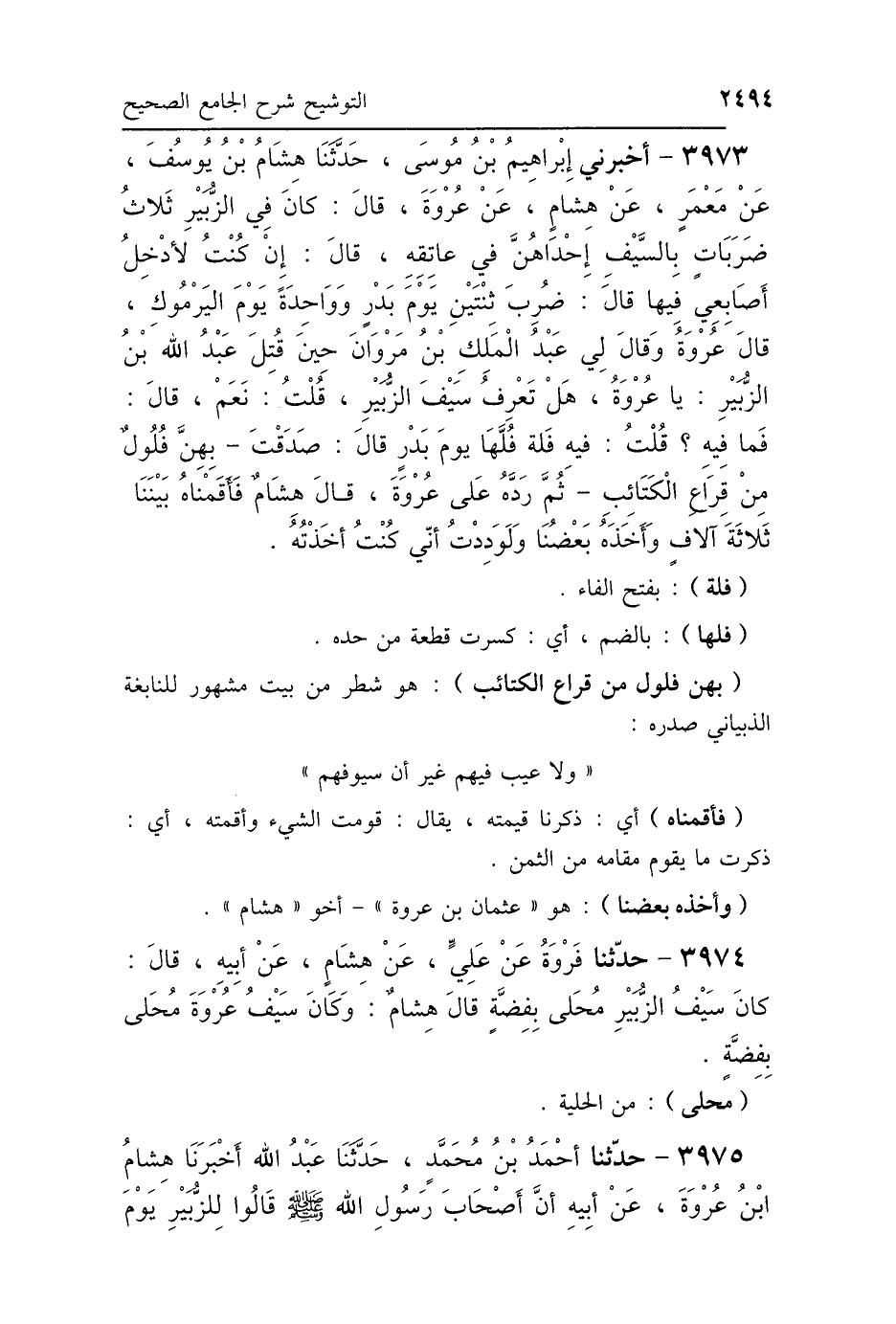 3973 - أَخْبَرَنِي إِبْرَاهِيمُ بْنُ مُوسَى، حَدَّثَنَا هِشَامُ بْنُ يُوسُفَ، عَنْ مَعْمَرٍ، أَخْبَرَنَا هِشَامٌ، عَنْ عُرْوَةَ قَالَ: «كَانَ فِي الزُّبَيْرِ ثَلَاثُ ضَرَبَاتٍ بِالسَّيْفِ إِحْدَاهُنَّ فِي عَاتِقِهِ» قَالَ: «إِنْ كُنْتُ لَأُدْخِلُ أَصَابِعِي فِيهَا» قَالَ: «ضُرِبَ ثِنْتَيْنِ يَوْمَ بَدْرٍ، وَوَاحِدَةً يَوْمَ اليَرْمُوكِ» قَالَ عُرْوَةُ: وَقَالَ لِي عَبْدُ المَلِكِ بْنُ مَرْوَانَ، حِينَ قُتِلَ عَبْدُ اللَّهِ بْنُ الزُّبَيْرِ: يَا عُرْوَةُ، هَلْ تَعْرِفُ سَيْفَ الزُّبَيْرِ؟ قُلْتُ: «نَعَمْ» قَالَ: فَمَا فِيهِ؟ قُلْتُ: «فِيهِ فَلَّةٌ فُلَّهَا يَوْمَ بَدْرٍ» قَالَ: صَدَقْتَ، بِهِنَّ فُلُولٌ مِنْ قِرَاعِ الكَتَائِبِ، ثُمَّ رَدَّهُ عَلَى عُرْوَةَ، قَالَ هِشَامٌ: فَأَقَمْنَاهُ بَيْنَنَا ثَلاَثَةَ آلَافٍ، وَأَخَذَهُ بَعْضُنَا، وَلَوَدِدْتُ أَنِّي كُنْتُ أَخَذْتُهُ.