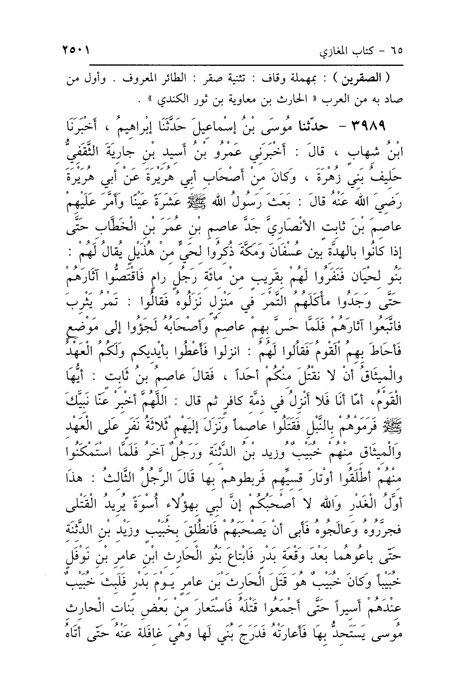 3989 - حَدَّثَنَا مُوسَى بْنُ إِسْمَاعِيلَ، حَدَّثَنَا إِبْرَاهِيمُ، أَخْبَرَنَا ابْنُ شِهَابٍ، قَالَ: أَخْبَرَنِي عُمَرُ بْنُ أَسِيدِ بْنِ جَارِيَةَ الثَّقَفِيُّ، حَلِيفُ بَنِي زُهْرَةَ، وَكَانَ مِنْ أَصْحَابِ أَبِي هُرَيْرَةَ، عَنْ أَبِي هُرَيْرَةَ رَضِيَ اللَّهُ عَنْهُ، قَالَ: «بَعَثَ رَسُولُ اللَّهِ صَلَّى اللهُ عَلَيْهِ وَسَلَّمَ عَشَرَةً عَيْنًا، وَأَمَّرَ عَلَيْهِمْ عَاصِمَ بْنَ ثَابِتٍ الأَنْصَارِيَّ جَدَّ عَاصِمِ بْنِ عُمَرَ بْنِ الخَطَّابِ» حَتَّى إِذَا كَانُوا بِالهَدَةِ بَيْنَ عَسْفَانَ، وَمَكَّةَ ذُكِرُوا لِحَيٍّ مِنْ هُذَيْلٍ يُقَالُ لَهُمْ بَنُو لِحْيَانَ، فَنَفَرُوا لَهُمْ بِقَرِيبٍ مِنْ مِائَةِ رَجُلٍ رَامٍ، فَاقْتَصُّوا آثَارَهُمْ حَتَّى وَجَدُوا مَأْكَلَهُمُ التَّمْرَ فِي مَنْزِلٍ نَزَلُوهُ، فَقَالُوا: تَمْرُ يَثْرِبَ، فَاتَّبَعُوا آثَارَهُمْ، فَلَمَّا حَسَّ بِهِمْ عَاصِمٌ وَأَصْحَابُهُ لَجَئُوا إِلَى مَوْضِعٍ فَأَحَاطَ بِهِمُ القَوْمُ، فَقَالُوا لَهُمْ: انْزِلُوا فَأَعْطُوا بِأَيْدِيكُمْ، وَلَكُمُ العَهْدُ وَالمِيثَاقُ: أَنْ لاَ نَقْتُلَ مِنْكُمْ أَحَدًا، فَقَالَ عَاصِمُ بْنُ ثَابِتٍ: أَيُّهَا القَوْمُ: أَمَّا أَنَا فَلاَ أَنْزِلُ فِي ذِمَّةِ كَافِرٍ، ثُمَّ قَالَ: اللَّهُمَّ أَخْبِرْ عَنَّا نَبِيَّكَ صَلَّى اللهُ عَلَيْهِ وَسَلَّمَ، فَرَمَوْهُمْ بِالنَّبْلِ فَقَتَلُوا عَاصِمًا، وَنَزَلَ إِلَيْهِمْ ثَلاَثَةُ نَفَرٍ عَلَى العَهْدِ وَالمِيثَاقِ، مِنْهُمْ خُبَيْبٌ، وَزَيْدُ بْنُ الدَّثِنَةِ، وَرَجُلٌ آخَرُ، فَلَمَّا اسْتَمْكَنُوا مِنْهُمْ أَطْلَقُوا أَوْتَارَ قِسِيِّهِمْ، فَرَبَطُوهُمْ بِهَا، قَالَ الرَّجُلُ الثَّالِثُ: هَذَا أَوَّلُ الغَدْرِ، وَاللَّهِ لاَ أَصْحَبُكُمْ، إِنَّ لِي بِهَؤُلاَءِ أُسْوَةً، يُرِيدُ القَتْلَى، فَجَرَّرُوهُ وَعَالَجُوهُ فَأَبَى أَنْ يَصْحَبَهُمْ، فَانْطُلِقَ بِخُبَيْبٍ، وَزَيْدِ بْنِ الدَّثِنَةِ حَتَّى بَاعُوهُمَا بَعْدَ وَقْعَةِ بَدْرٍ، فَابْتَاعَ بَنُو الحَارِثِ بْنِ عَامِرِ بْنِ نَوْفَلٍ خُبَيْبًا، وَكَانَ خُبَيْبٌ هُوَ قَتَلَ الحَارِثَ بْنَ عَامِرٍ يَوْمَ بَدْرٍ، فَلَبِثَ خُبَيْبٌ عِنْدَهُمْ أَسِيرًا حَتَّى أَجْمَعُوا قَتْلَهُ، فَاسْتَعَارَ مِنْ بَعْضِ بَنَاتِ الحَارِثِ مُوسًى يَسْتَحِدُّ بِهَا فَأَعَارَتْهُ، فَدَرَجَ بُنَيٌّ لَهَا وَهِيَ غَافِلَةٌ حَتَّى أَتَاهُ،