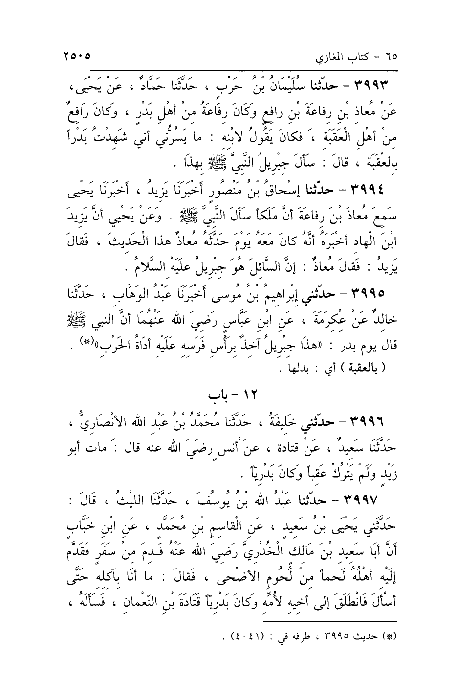 3993 - حَدَّثَنَا سُلَيْمَانُ بْنُ حَرْبٍ، حَدَّثَنَا حَمَّادٌ، عَنْ يَحْيَى، عَنْ مُعَاذِ بْنِ رِفَاعَةَ بْنِ رَافِعٍ، وَكَانَ رِفَاعَةُ مِنْ أَهْلِ بَدْرٍ، وَكَانَ رَافِعٌ مِنْ أَهْلِ العَقَبَةِ، فَكَانَ يَقُولُ لِابْنِهِ: مَا يَسُرُّنِي أَنِّي شَهِدْتُ بَدْرًا، بِالعَقَبَةِ قَالَ: سَأَلَ جِبْرِيلُ النَّبِيَّ صَلَّى اللهُ عَلَيْهِ وَسَلَّمَ بِهَذَا".