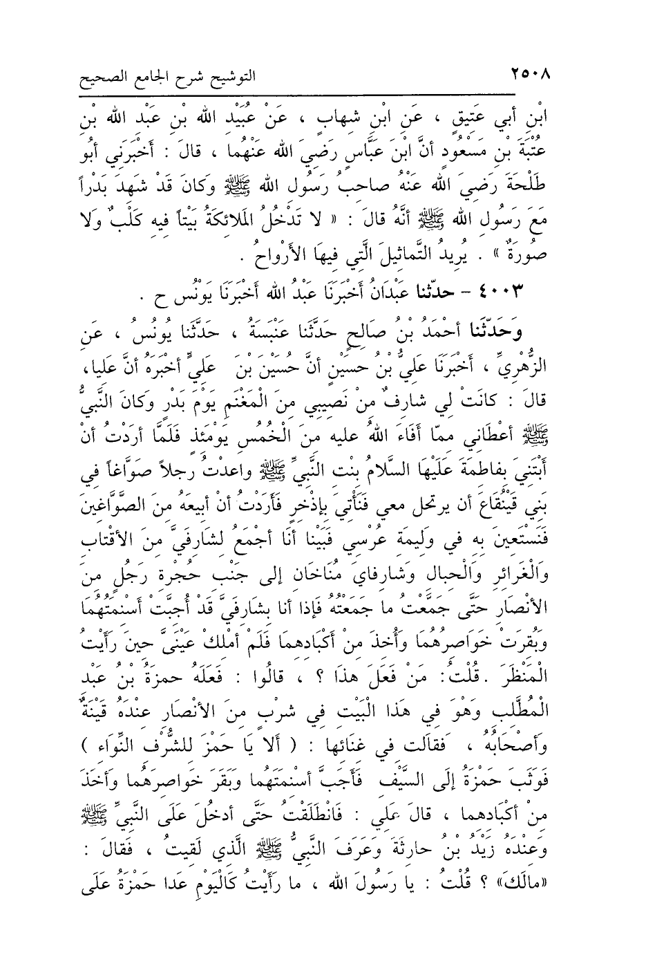 4003 - حَدَّثَنَا عَبْدَانُ، أَخْبَرَنَا عَبْدُ اللَّهِ، أَخْبَرَنَا يُونُسُ، ح وحَدَّثَنَا أَحْمَدُ بْنُ صَالِحٍ، حَدَّثَنَا عَنْبَسَةُ، حَدَّثَنَا يُونُسُ، عَنِ الزُّهْرِيِّ، أَخْبَرَنَا عَلِيُّ بْنُ حُسَيْنٍ، أَنَّ حُسَيْنَ بْنَ عَلِيٍّ عَلَيْهِمُ السَّلاَمُ، أَخْبَرَهُ أَنَّ عَلِيًّا قَالَ: كَانَتْ لِي شَارِفٌ مِنْ نَصِيبِي مِنَ المَغْنَمِ يَوْمَ بَدْرٍ، وَكَانَ النَّبِيُّ صَلَّى اللهُ عَلَيْهِ وَسَلَّمَ أَعْطَانِي مِمَّا أَفَاءَ اللَّهُ عَلَيْهِ مِنَ الخُمُسِ يَوْمَئِذٍ، فَلَمَّا أَرَدْتُ أَنْ أَبْتَنِيَ بِفَاطِمَةَ عَلَيْهَا السَّلاَمُ، بِنْتِ النَّبِيِّ صَلَّى اللهُ عَلَيْهِ وَسَلَّمَ، وَاعَدْتُ رَجُلًا صَوَّاغًا فِي بَنِي قَيْنُقَاعَ أَنْ يَرْتَحِلَ مَعِي، فَنَأْتِيَ بِإِذْخِرٍ، فَأَرَدْتُ أَنْ أَبِيعَهُ مِنَ الصَّوَّاغِينَ، فَنَسْتَعِينَ بِهِ فِي وَلِيمَةِ عُرْسِي، فَبَيْنَا أَنَا أَجْمَعُ لِشَارِفَيَّ مِنَ الأَقْتَابِ وَالغَرَائِرِ وَالحِبَالِ، وَشَارِفَايَ مُنَاخَانِ إِلَى جَنْبِ حُجْرَةِ رَجُلٍ مِنَ الأَنْصَارِ، حَتَّى جَمَعْتُ مَا جَمَعْتُ، فَإِذَا أَنَا بِشَارِفَيَّ قَدْ أُجِبَّتْ أَسْنِمَتُهَا، وَبُقِرَتْ خَوَاصِرُهُمَا، وَأُخِذَ مِنْ أَكْبَادِهِمَا، فَلَمْ أَمْلِكْ عَيْنَيَّ حِينَ رَأَيْتُ المَنْظَرَ، قُلْتُ: مَنْ فَعَلَ هَذَا؟ قَالُوا فَعَلَهُ حَمْزَةُ بْنُ عَبْدِ المُطَّلِبِ، وَهُوَ فِي هَذَا البَيْتِ، فِي شَرْبٍ مِنَ الأَنْصَارِ، عِنْدَهُ قَيْنَةٌ وَأَصْحَابُهُ، فَقَالَتْ فِي غِنَائِهَا: أَلاَ يَا حَمْزُ لِلشُّرُفِ النِّوَاءِ، فَوَثَبَ حَمْزَةُ إِلَى السَّيْفِ، فَأَجَبَّ أَسْنِمَتَهُمَا وَبَقَرَ خَوَاصِرَهُمَا، وَأَخَذَ مِنْ أَكْبَادِهِمَا، قَالَ عَلِيٌّ: فَانْطَلَقْتُ حَتَّى أَدْخُلَ عَلَى النَّبِيِّ صَلَّى اللهُ عَلَيْهِ وَسَلَّمَ، وَعِنْدَهُ زَيْدُ بْنُ حَارِثَةَ، وَعَرَفَ النَّبِيُّ صَلَّى اللهُ عَلَيْهِ وَسَلَّمَ الَّذِي لَقِيتُ، فَقَالَ: «مَا لَكَ» قُلْتُ: يَا رَسُولَ اللَّهِ، مَا رَأَيْتُ كَاليَوْمِ، عَدَا حَمْزَةُ عَلَى