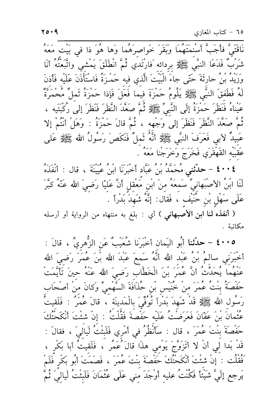 نَاقَتَيَّ، فَأَجَبَّ أَسْنِمَتَهُمَا، وَبَقَرَ خَوَاصِرَهُمَا، وَهَا هُوَ ذَا فِي بَيْتٍ مَعَهُ شَرْبٌ، فَدَعَا النَّبِيُّ صَلَّى اللهُ عَلَيْهِ وَسَلَّمَ بِرِدَائِهِ فَارْتَدَى، ثُمَّ انْطَلَقَ يَمْشِي، وَاتَّبَعْتُهُ أَنَا وَزَيْدُ بْنُ حَارِثَةَ، حَتَّى جَاءَ البَيْتَ الَّذِي فِيهِ حَمْزَةُ، فَاسْتَأْذَنَ عَلَيْهِ، فَأُذِنَ لَهُ، فَطَفِقَ النَّبِيُّ صَلَّى اللهُ عَلَيْهِ وَسَلَّمَ يَلُومُ حَمْزَةَ فِيمَا فَعَلَ، فَإِذَا حَمْزَةُ ثَمِلٌ، مُحْمَرَّةٌ عَيْنَاهُ، فَنَظَرَ حَمْزَةُ إِلَى النَّبِيِّ صَلَّى اللهُ عَلَيْهِ وَسَلَّمَ ثُمَّ صَعَّدَ النَّظَرَ فَنَظَرَ إِلَى رُكْبَتِهِ، ثُمَّ صَعَّدَ النَّظَرَ فَنَظَرَ إِلَى وَجْهِهِ، ثُمَّ قَالَ حَمْزَةُ: وَهَلْ أَنْتُمْ إِلَّا عَبِيدٌ لِأَبِي، فَعَرَفَ النَّبِيُّ صَلَّى اللهُ عَلَيْهِ وَسَلَّمَ أَنَّهُ ثَمِلٌ فَنَكَصَ رَسُولُ اللَّهِ صَلَّى اللهُ عَلَيْهِ وَسَلَّمَ عَلَى عَقِبَيْهِ القَهْقَرَى فَخَرَجَ وَخَرَجْنَا مَعَهُ.