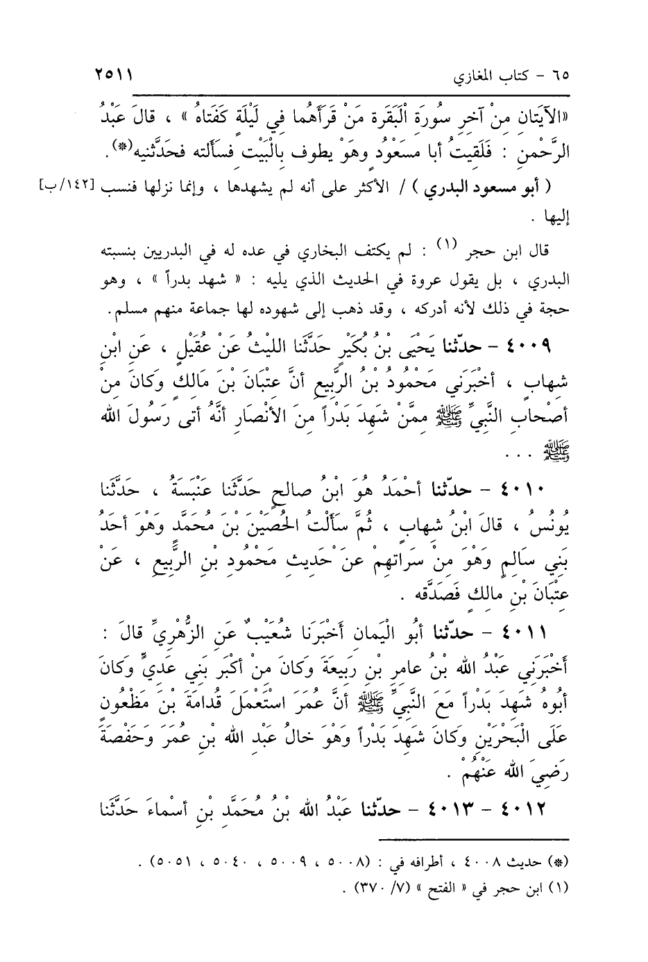 قال ابن حجر: لم يكتف البخاري في عده له في البدريين بنسبته البدري، بل يقول عروة في الحديث الذي يليه: "شهد بدرًا"، وهو حجة في ذلك لأنه أدركه، وقد ذهب إلى شهوده لها جماعة منهم مسلم.