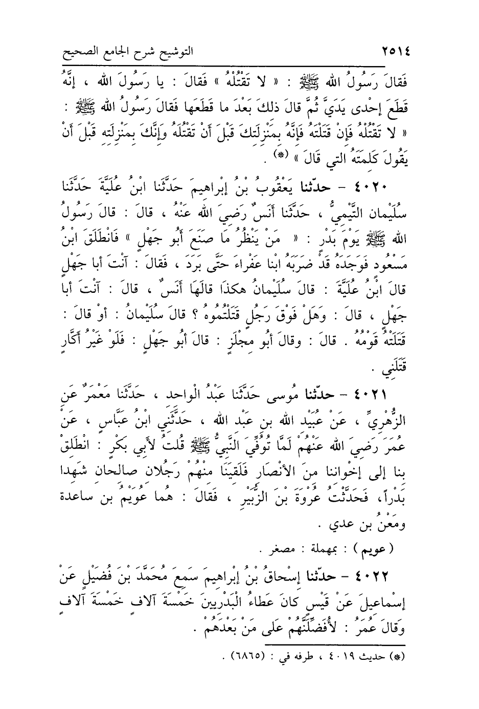 4020 - حَدَّثَنِي يَعْقُوبُ بْنُ إِبْرَاهِيمَ، حَدَّثَنَا ابْنُ عُلَيَّةَ، حَدَّثَنَا سُلَيْمَانُ التَّيْمِيُّ، حَدَّثَنَا أَنَسٌ رَضِيَ اللَّهُ عَنْهُ، قَالَ: قَالَ رَسُولُ اللَّهِ صَلَّى اللهُ عَلَيْهِ وَسَلَّمَ يَوْمَ بَدْرٍ: «مَنْ يَنْظُرُ مَا صَنَعَ أَبُو جَهْلٍ» فَانْطَلَقَ ابْنُ مَسْعُودٍ، فَوَجَدَهُ قَدْ ضَرَبَهُ ابْنَا عَفْرَاءَ حَتَّى بَرَدَ، فَقَالَ: آنْتَ أَبَا جَهْلٍ؟ قَالَ ابْنُ عُلَيَّةَ، قَالَ سُلَيْمَانُ: هَكَذَا قَالَهَا أَنَسٌ، قَالَ: " أَنْتَ أَبَا جَهْلٍ؟ قَالَ: وَهَلْ فَوْقَ رَجُلٍ قَتَلْتُمُوهُ " قَالَ سُلَيْمَانُ: أَوْ قَالَ: «قَتَلَهُ قَوْمُهُ» قَالَ: وَقَالَ أَبُو مِجْلَزٍ: «قَالَ أَبُو جَهْلٍ فَلَوْ غَيْرُ أَكَّارٍ قَتَلَنِي».