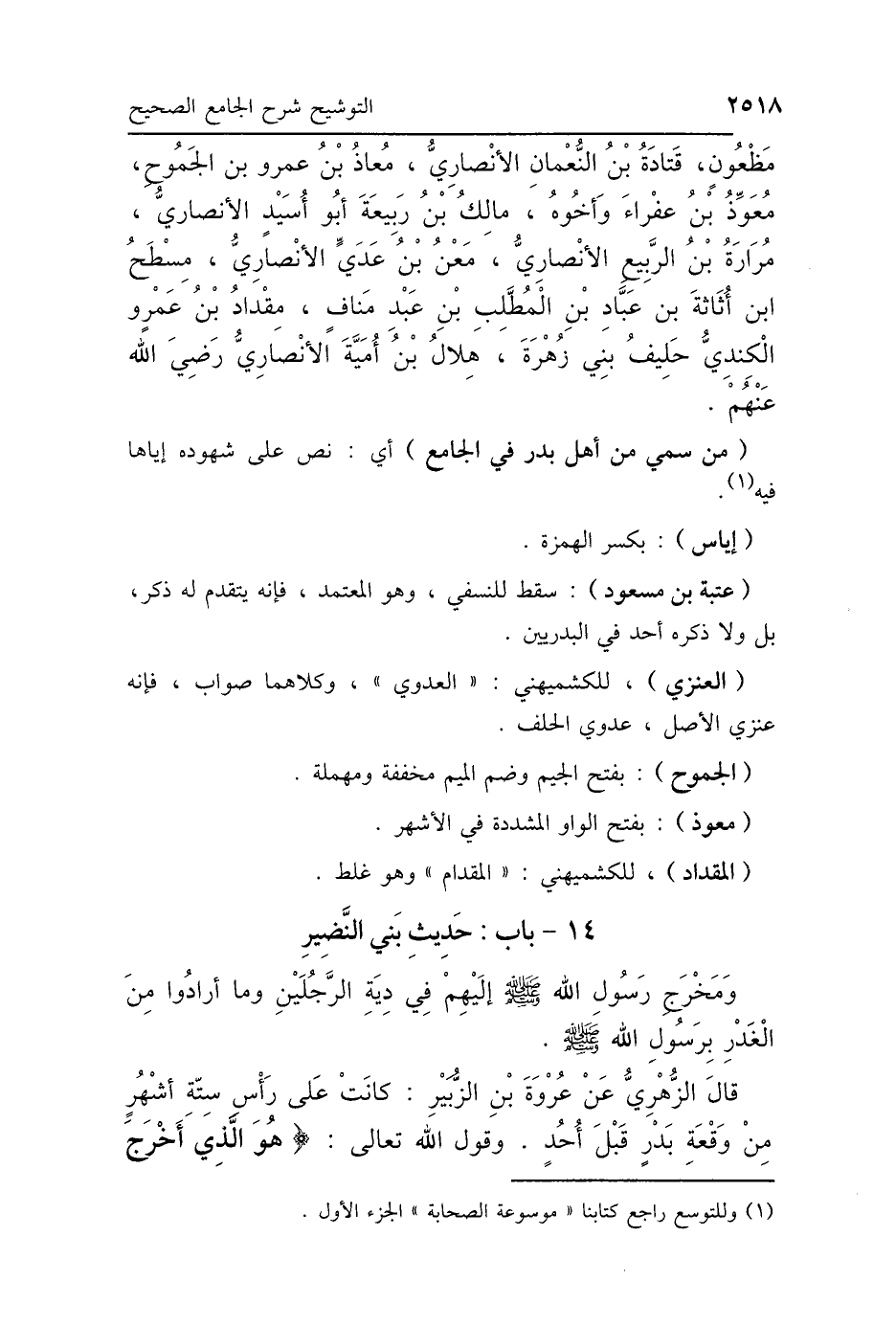 مَظْعُونٍ، قَتَادَةُ بْنُ النُّعْمَانِ الأَنْصَارِيُّ، مُعَاذُ بْنُ عَمْرِو بْنِ الجَمُوحِ، مُعَوِّذُ ابْنُ عَفْرَاءَ وَأَخُوهُ مَالِكُ بْنُ رَبِيعَةَ أَبُو أُسَيْدٍ الأَنْصَارِيُّ، مُرَارَةُ بْنُ الرَّبِيعِ الأَنْصَارِيُّ، مَعْنُ بْنُ عَدِيٍّ الأَنْصَارِيُّ، مِسْطَحُ بْنُ أُثَاثَةَ بْنِ عَبَّادِ بْنِ المُطَّلِبِ بْنِ عَبْدِ مَنَافٍ، مِقْدَادُ بْنُ عَمْرٍو الكِنْدِيُّ، حَلِيفُ بَنِي زُهْرَةَ، هِلاَلُ بْنُ أُمَيَّةَ الأَنْصَارِيُّ».
