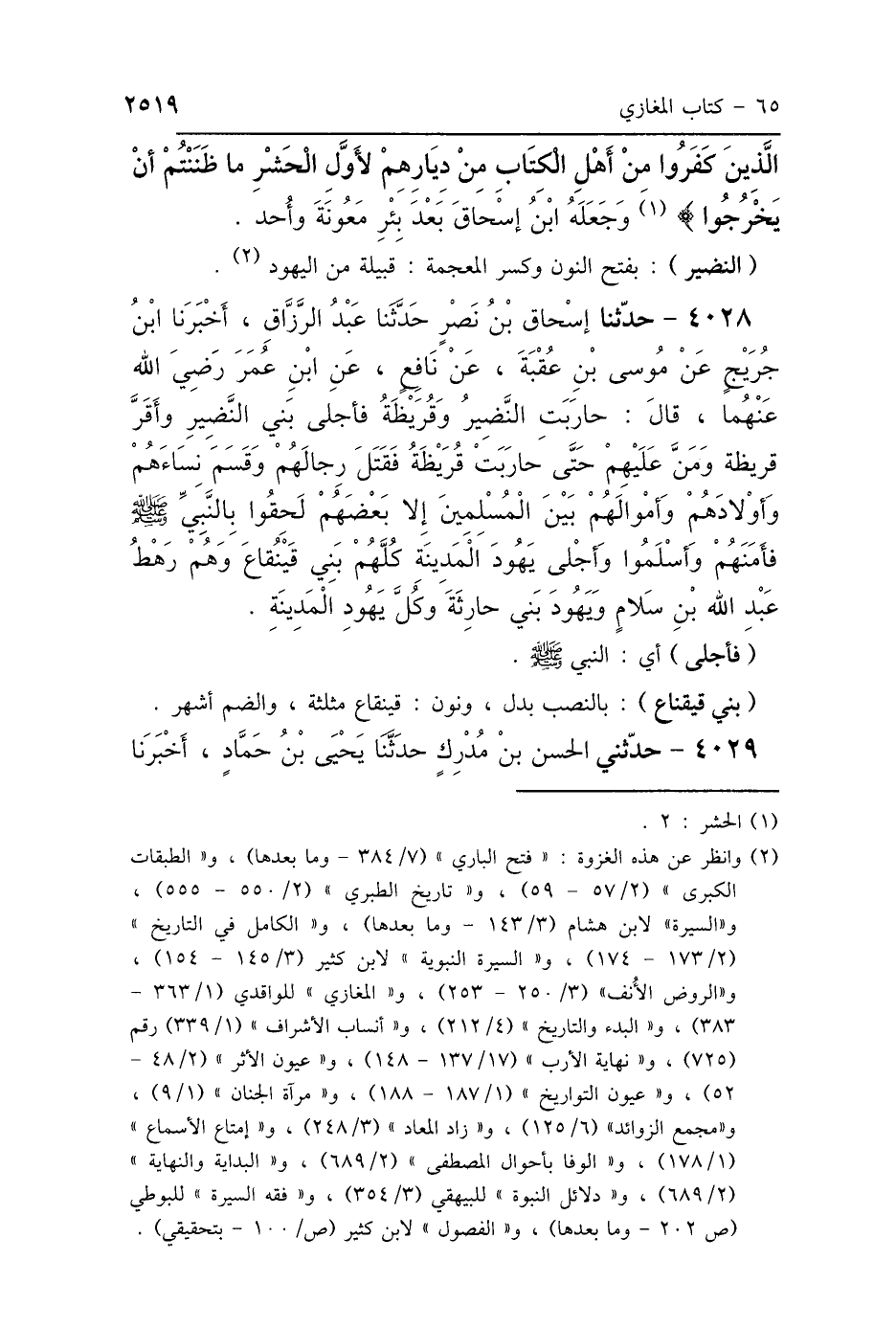 الَّذِينَ كَفَرُوا مِنْ أَهْلِ الكِتَابِ مِنْ دِيَارِهِمْ لِأَوَّلِ الحَشْرِ مَا ظَنَنْتُمْ أَنْ يَخْرُجُوا} [الحشر: 2] وَجَعَلَهُ ابْنُ إِسْحَاقَ بَعْدَ بِئْرِ مَعُونَةَ، وَأُحُدٍ.
