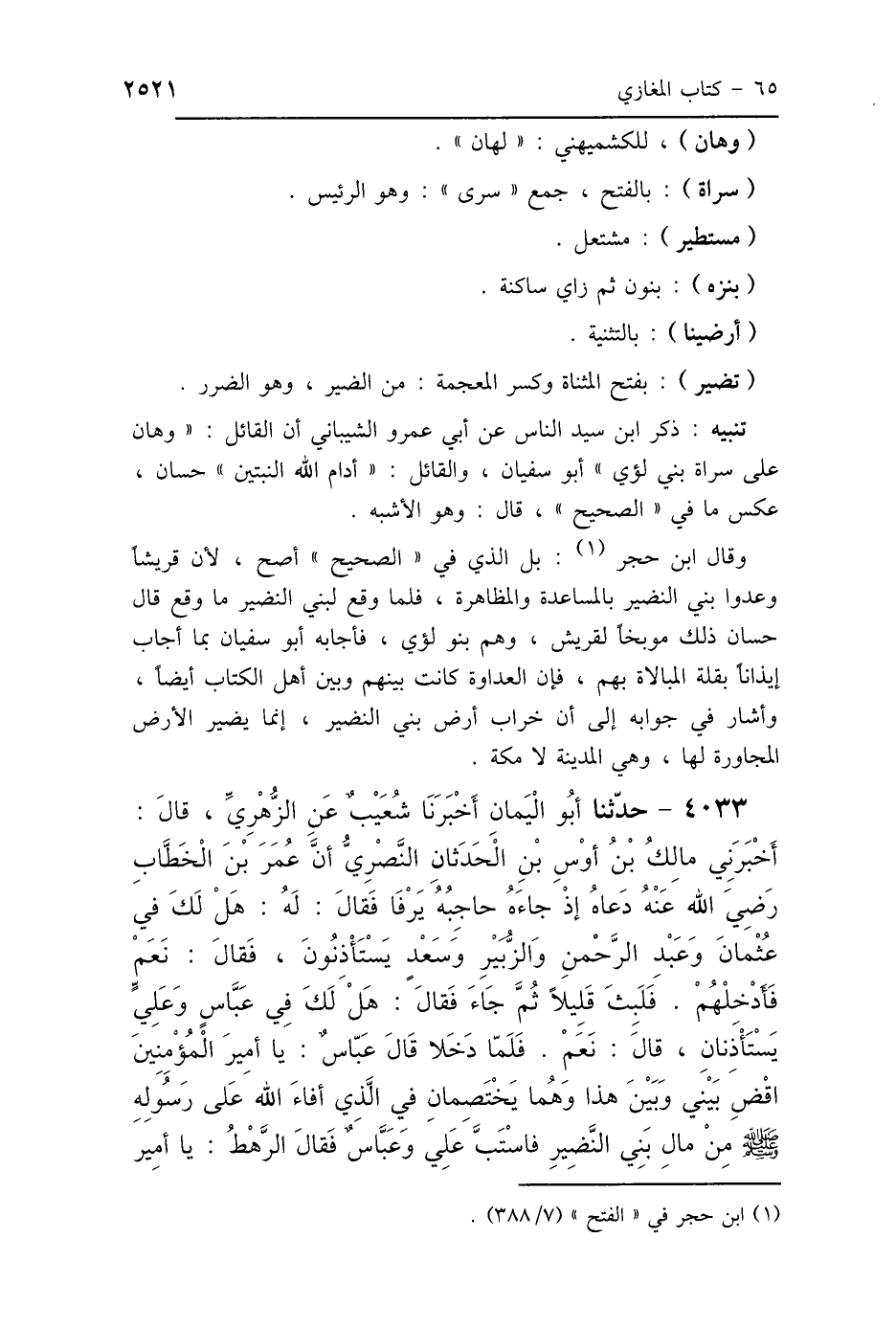 وقال ابن حجر: بل الذي في "الصحيح" أصح، لأن قريشًا وعدوا بني النضير بالمساعدة والمظاهرة، فلما وقع لبني النضير ما وقع قال حسان ذلك موبخًا لقريش، وهم بنو لؤي، فأجابه أبو سفيان بما أجاب إيذانًا بقلة المبالاة بهم، فإن العداوة كانت بينهم وبين أهل الكتاب أيضًا، وأشار في جوابه إلى أن خراب أرض بني النضير، إنما يضير الأرض المجاورة لها، وهي المدينة لا مكة.