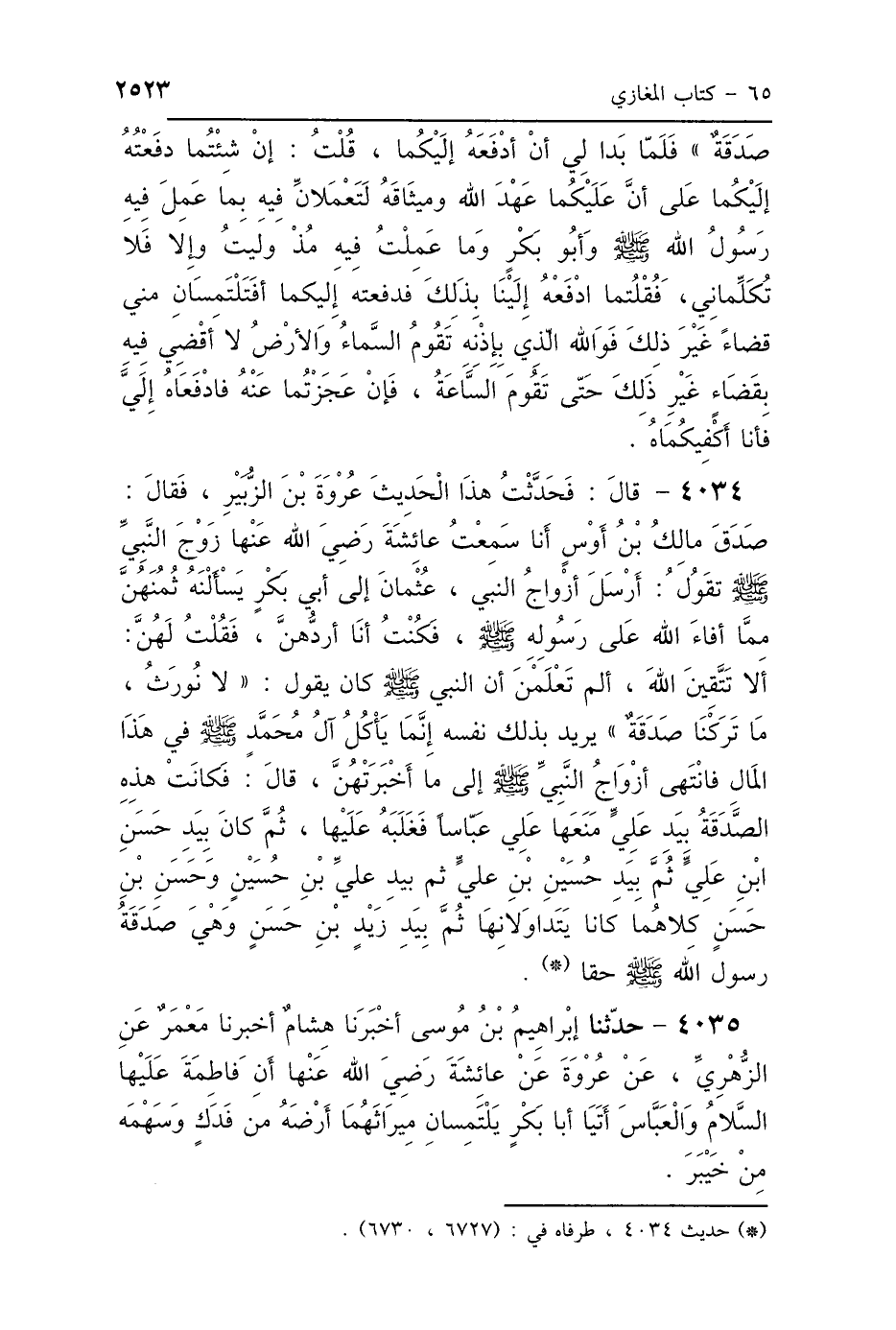 4034 - قَالَ: فَحَدَّثْتُ هَذَا الحَدِيثَ عُرْوَةَ بْنَ الزُّبَيْرِ، فَقَالَ: صَدَقَ مَالِكُ بْنُ أَوْسٍ: أَنَا سَمِعْتُ عَائِشَةَ رَضِيَ اللَّهُ عَنْهَا، زَوْجَ النَّبِيِّ صَلَّى اللهُ عَلَيْهِ وَسَلَّمَ، تَقُولُ: " أَرْسَلَ أَزْوَاجُ النَّبِيِّ صَلَّى اللهُ عَلَيْهِ وَسَلَّمَ عُثْمَانَ إِلَى أَبِي بَكْرٍ، يَسْأَلْنَهُ ثُمُنَهُنَّ مِمَّا أَفَاءَ اللَّهُ عَلَى رَسُولِهِ صَلَّى اللهُ عَلَيْهِ وَسَلَّمَ فَكُنْتُ أَنَا أَرُدُّهُنَّ، فَقُلْتُ لَهُنَّ: أَلاَ تَتَّقِينَ اللَّهَ، أَلَمْ تَعْلَمْنَ أَنَّ النَّبِيَّ صَلَّى اللهُ عَلَيْهِ وَسَلَّمَ كَانَ يَقُولُ: «لاَ نُورَثُ، مَا تَرَكْنَا صَدَقَةٌ - يُرِيدُ بِذَلِكَ نَفْسَهُ - إِنَّمَا يَأْكُلُ آلُ مُحَمَّدٍ صَلَّى اللهُ عَلَيْهِ وَسَلَّمَ فِي هَذَا المَالِ» فَانْتَهَى أَزْوَاجُ النَّبِيِّ صَلَّى اللهُ عَلَيْهِ وَسَلَّمَ إِلَى مَا أَخْبَرَتْهُنَّ، قَالَ: فَكَانَتْ هَذِهِ الصَّدَقَةُ بِيَدِ عَلِيٍّ، مَنَعَهَا عَلِيٌّ عَبَّاسًا فَغَلَبَهُ عَلَيْهَا، ثُمَّ كَانَ بِيَدِ حَسَنِ بْنِ عَلِيٍّ، ثُمَّ بِيَدِ حُسَيْنِ بْنِ عَلِيٍّ، ثُمَّ بِيَدِ عَلِيِّ بْنِ حُسَيْنٍ، وَحَسَنِ بْنِ حَسَنٍ، كِلاَهُمَا كَانَا يَتَدَاوَلاَنِهَا، ثُمَّ بِيَدِ زَيْدِ بْنِ حَسَنٍ، وَهِيَ صَدَقَةُ رَسُولِ اللَّهِ صَلَّى اللهُ عَلَيْهِ وَسَلَّمَ حَقًّا.