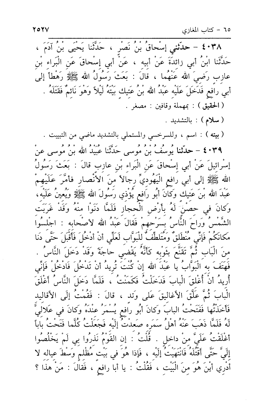 4039 - حَدَّثَنَا يُوسُفُ بْنُ مُوسَى، حَدَّثَنَا عُبَيْدُ اللَّهِ بْنُ مُوسَى، عَنْ إِسْرَائِيلَ، عَنْ أَبِي إِسْحَاقَ، عَنِ البَرَاءِ بْنِ عَازِبٍ، قَالَ: بَعَثَ رَسُولُ اللَّهِ صَلَّى اللهُ عَلَيْهِ وَسَلَّمَ إِلَى أَبِي رَافِعٍ اليَهُودِيِّ رِجَالًا مِنَ الأَنْصَارِ، فَأَمَّرَ عَلَيْهِمْ عَبْدَ اللَّهِ بْنَ عَتِيكٍ، وَكَانَ أَبُو رَافِعٍ يُؤْذِي رَسُولَ اللَّهِ صَلَّى اللهُ عَلَيْهِ وَسَلَّمَ وَيُعِينُ عَلَيْهِ، وَكَانَ فِي حِصْنٍ لَهُ بِأَرْضِ الحِجَازِ، فَلَمَّا دَنَوْا مِنْهُ، وَقَدْ غَرَبَتِ الشَّمْسُ، وَرَاحَ النَّاسُ بِسَرْحِهِمْ، فَقَالَ عَبْدُ اللَّهِ لِأَصْحَابِهِ: اجْلِسُوا مَكَانَكُمْ، فَإِنِّي مُنْطَلِقٌ، وَمُتَلَطِّفٌ لِلْبَوَّابِ، لَعَلِّي أَنْ أَدْخُلَ، فَأَقْبَلَ حَتَّى دَنَا مِنَ البَابِ، ثُمَّ تَقَنَّعَ بِثَوْبِهِ كَأَنَّهُ يَقْضِي حَاجَةً، وَقَدْ دَخَلَ النَّاسُ، فَهَتَفَ بِهِ البَوَّابُ، يَا عَبْدَ اللَّهِ: إِنْ كُنْتَ تُرِيدُ أَنْ تَدْخُلَ فَادْخُلْ، فَإِنِّي أُرِيدُ أَنْ أُغْلِقَ البَابَ، فَدَخَلْتُ فَكَمَنْتُ، فَلَمَّا دَخَلَ النَّاسُ أَغْلَقَ البَابَ، ثُمَّ عَلَّقَ الأَغَالِيقَ عَلَى وَتَدٍ، قَالَ: فَقُمْتُ إِلَى الأَقَالِيدِ فَأَخَذْتُهَا، فَفَتَحْتُ البَابَ، وَكَانَ أَبُو رَافِعٍ يُسْمَرُ عِنْدَهُ، وَكَانَ فِي عَلاَلِيَّ لَهُ، فَلَمَّا ذَهَبَ عَنْهُ أَهْلُ سَمَرِهِ صَعِدْتُ إِلَيْهِ، فَجَعَلْتُ كُلَّمَا فَتَحْتُ بَابًا أَغْلَقْتُ عَلَيَّ مِنْ دَاخِلٍ، قُلْتُ: إِنِ القَوْمُ نَذِرُوا بِي لَمْ يَخْلُصُوا إِلَيَّ حَتَّى أَقْتُلَهُ، فَانْتَهَيْتُ إِلَيْهِ، فَإِذَا هُوَ فِي بَيْتٍ مُظْلِمٍ وَسْطَ عِيَالِهِ، لاَ أَدْرِي أَيْنَ هُوَ مِنَ البَيْتِ، فَقُلْتُ: يَا أَبَا رَافِعٍ، قَالَ: مَنْ هَذَا؟
