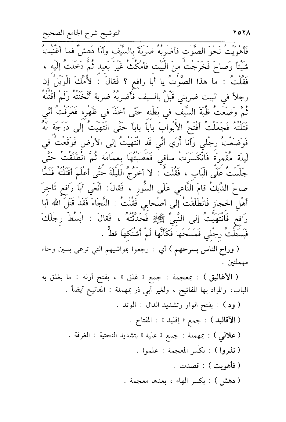 فَأَهْوَيْتُ نَحْوَ الصَّوْتِ فَأَضْرِبُهُ ضَرْبَةً بِالسَّيْفِ وَأَنَا دَهِشٌ، فَمَا أَغْنَيْتُ شَيْئًا، وَصَاحَ، فَخَرَجْتُ مِنَ البَيْتِ، فَأَمْكُثُ غَيْرَ بَعِيدٍ، ثُمَّ دَخَلْتُ إِلَيْهِ، فَقُلْتُ: مَا هَذَا الصَّوْتُ يَا أَبَا رَافِعٍ؟ فَقَالَ: لِأُمِّكَ الوَيْلُ، إِنَّ رَجُلًا فِي البَيْتِ ضَرَبَنِي قَبْلُ بِالسَّيْفِ، قَالَ: فَأَضْرِبُهُ ضَرْبَةً أَثْخَنَتْهُ وَلَمْ أَقْتُلْهُ، ثُمَّ وَضَعْتُ ظِبَةَ السَّيْفِ فِي بَطْنِهِ حَتَّى أَخَذَ فِي ظَهْرِهِ، فَعَرَفْتُ أَنِّي قَتَلْتُهُ، فَجَعَلْتُ أَفْتَحُ الأَبْوَابَ بَابًا بَابًا، حَتَّى انْتَهَيْتُ إِلَى دَرَجَةٍ لَهُ، فَوَضَعْتُ رِجْلِي، وَأَنَا أُرَى أَنِّي قَدِ انْتَهَيْتُ إِلَى الأَرْضِ، فَوَقَعْتُ فِي لَيْلَةٍ مُقْمِرَةٍ، فَانْكَسَرَتْ سَاقِي فَعَصَبْتُهَا بِعِمَامَةٍ، ثُمَّ انْطَلَقْتُ حَتَّى جَلَسْتُ عَلَى البَابِ، فَقُلْتُ: لاَ أَخْرُجُ اللَّيْلَةَ حَتَّى أَعْلَمَ: أَقَتَلْتُهُ؟ فَلَمَّا صَاحَ الدِّيكُ قَامَ النَّاعِي عَلَى السُّورِ، فَقَالَ: أَنْعَى أَبَا رَافِعٍ تَاجِرَ أَهْلِ الحِجَازِ، فَانْطَلَقْتُ إِلَى أَصْحَابِي، فَقُلْتُ: النَّجَاءَ، فَقَدْ قَتَلَ اللَّهُ أَبَا رَافِعٍ، فَانْتَهَيْتُ إِلَى النَّبِيِّ صَلَّى اللهُ عَلَيْهِ وَسَلَّمَ فَحَدَّثْتُهُ، فَقَالَ: «ابْسُطْ رِجْلَكَ» فَبَسَطْتُ رِجْلِي فَمَسَحَهَا، فَكَأَنَّهَا لَمْ أَشْتَكِهَا قَطُّ.