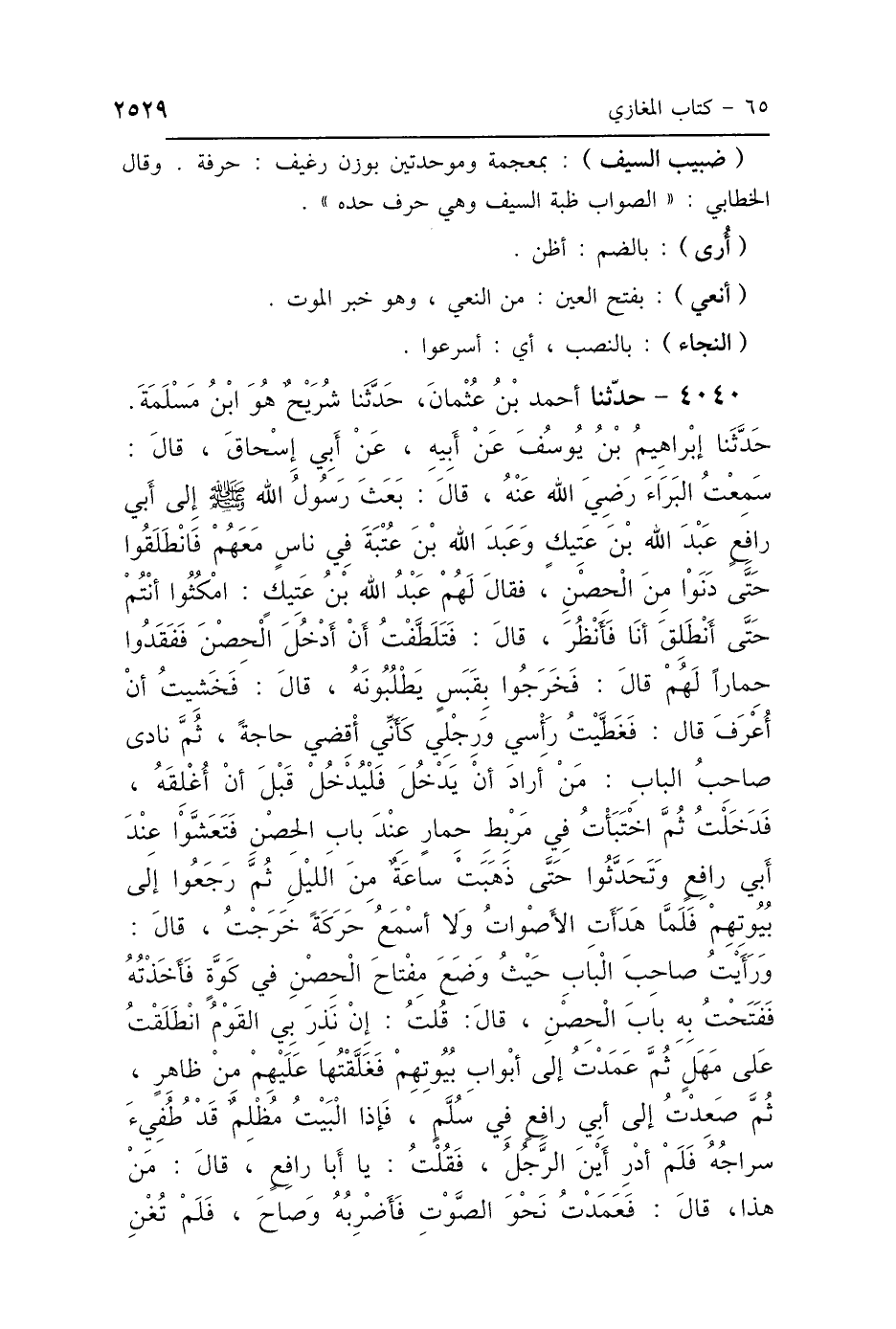 4040 - حَدَّثَنَا أَحْمَدُ بْنُ عُثْمَانَ، حَدَّثَنَا شُرَيْحٌ هُوَ ابْنُ مَسْلَمَةَ، حَدَّثَنَا إِبْرَاهِيمُ بْنُ يُوسُفَ، عَنْ أَبِيهِ، عَنْ أَبِي إِسْحَاقَ، قَالَ: سَمِعْتُ البَرَاءَ بْنَ عَازِبٍ رَضِيَ اللَّهُ عَنْهُ، قَالَ: «بَعَثَ رَسُولُ اللَّهِ صَلَّى اللهُ عَلَيْهِ وَسَلَّمَ إِلَى أَبِي رَافِعٍ عَبْدَ اللَّهِ بْنَ عَتِيكٍ، وَعَبْدَ اللَّهِ بْنَ عُتْبَةَ، فِي نَاسٍ مَعَهُمْ، فَانْطَلَقُوا حَتَّى دَنَوْا مِنَ الحِصْنِ» فَقَالَ لَهُمْ عَبْدُ اللَّهِ بْنُ عَتِيكٍ: امْكُثُوا أَنْتُمْ حَتَّى أَنْطَلِقَ أَنَا فَأَنْظُرَ، قَالَ: فَتَلَطَّفْتُ أَنْ أَدْخُلَ الحِصْنَ، فَفَقَدُوا حِمَارًا لَهُمْ، قَالَ: فَخَرَجُوا بِقَبَسٍ يَطْلُبُونَهُ، قَالَ: فَخَشِيتُ أَنْ أُعْرَفَ، قَالَ: فَغَطَّيْتُ رَأْسِي وَجَلَسْتُ كَأَنِّي أَقْضِي حَاجَةً، ثُمَّ نَادَى صَاحِبُ البَابِ، مَنْ أَرَادَ أَنْ يَدْخُلَ فَلْيَدْخُلْ قَبْلَ أَنْ أُغْلِقَهُ، فَدَخَلْتُ ثُمَّ اخْتَبَأْتُ فِي مَرْبِطِ حِمَارٍ عِنْدَ بَابِ الحِصْنِ، فَتَعَشَّوْا عِنْدَ أَبِي رَافِعٍ، وَتَحَدَّثُوا حَتَّى ذَهَبَتْ سَاعَةٌ مِنَ اللَّيْلِ، ثُمَّ رَجَعُوا إِلَى بُيُوتِهِمْ، فَلَمَّا هَدَأَتِ الأَصْوَاتُ، وَلاَ أَسْمَعُ حَرَكَةً خَرَجْتُ، قَالَ: وَرَأَيْتُ صَاحِبَ البَابِ، حَيْثُ وَضَعَ مِفْتَاحَ الحِصْنِ فِي كَوَّةٍ، فَأَخَذْتُهُ فَفَتَحْتُ بِهِ بَابَ الحِصْنِ، قَالَ: قُلْتُ: إِنْ نَذِرَ بِي القَوْمُ انْطَلَقْتُ عَلَى مَهَلٍ، ثُمَّ عَمَدْتُ إِلَى أَبْوَابِ بُيُوتِهِمْ، فَغَلَّقْتُهَا عَلَيْهِمْ مِنْ ظَاهِرٍ، ثُمَّ صَعِدْتُ إِلَى أَبِي رَافِعٍ فِي سُلَّمٍ، فَإِذَا البَيْتُ مُظْلِمٌ، قَدْ طَفِئَ سِرَاجُهُ، فَلَمْ أَدْرِ أَيْنَ الرَّجُلُ، فَقُلْتُ: يَا أَبَا رَافِعٍ قَالَ: مَنْ هَذَا؟ قَالَ: فَعَمَدْتُ نَحْوَ الصَّوْتِ فَأَضْرِبُهُ وَصَاحَ، فَلَمْ تُغْنِ