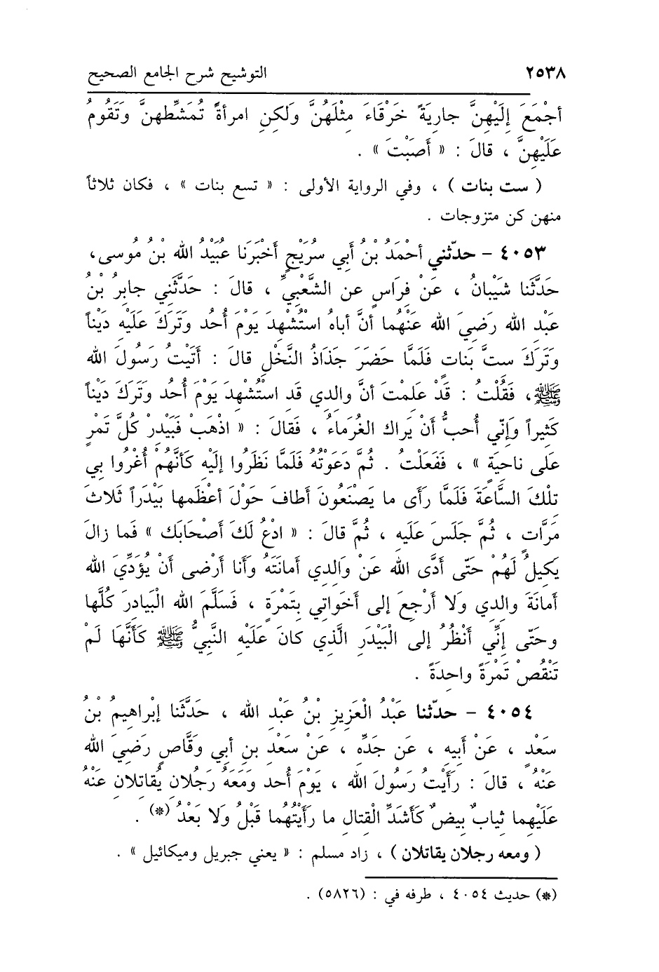 4053 - حَدَّثَنِي أَحْمَدُ بْنُ أَبِي سُرَيْجٍ، أَخْبَرَنَا عُبَيْدُ اللَّهِ بْنُ مُوسَى، حَدَّثَنَا شَيْبَانُ، عَنْ فِرَاسٍ، عَنِ الشَّعْبِيِّ، قَالَ: حَدَّثَنِي جَابِرُ بْنُ عَبْدِ اللَّهِ رَضِيَ اللَّهُ عَنْهُمَا، أَنَّ أَبَاهُ، اسْتُشْهِدَ يَوْمَ أُحُدٍ وَتَرَكَ عَلَيْهِ دَيْنًا، وَتَرَكَ سِتَّ بَنَاتٍ، فَلَمَّا حَضَرَ جِزَازُ النَّخْلِ قَالَ: أَتَيْتُ رَسُولَ اللَّهِ صَلَّى اللهُ عَلَيْهِ وَسَلَّمَ فَقُلْتُ: قَدْ عَلِمْتَ أَنَّ وَالِدِي قَدِ اسْتُشْهِدَ يَوْمَ أُحُدٍ وَتَرَكَ دَيْنًا كَثِيرًا، وَإِنِّي أُحِبُّ أَنْ يَرَاكَ الغُرَمَاءُ، فَقَالَ: «اذْهَبْ فَبَيْدِرْ كُلَّ تَمْرٍ عَلَى نَاحِيَةٍ»، فَفَعَلْتُ ثُمَّ دَعَوْتُهُ، فَلَمَّا نَظَرُوا إِلَيْهِ كَأَنَّهُمْ أُغْرُوا بِي تِلْكَ السَّاعَةَ، فَلَمَّا رَأَى مَا يَصْنَعُونَ أَطَافَ حَوْلَ أَعْظَمِهَا بَيْدَرًا ثَلاَثَ مَرَّاتٍ، ثُمَّ جَلَسَ عَلَيْهِ، ثُمَّ قَالَ: «ادْعُ لِي أَصْحَابَكَ» فَمَا زَالَ يَكِيلُ لَهُمْ حَتَّى أَدَّى اللَّهُ عَنْ وَالِدِي أَمَانَتَهُ، وَأَنَا أَرْضَى أَنْ يُؤَدِّيَ اللَّهُ أَمَانَةَ وَالِدِي، وَلاَ أَرْجِعَ إِلَى أَخَوَاتِي بِتَمْرَةٍ، فَسَلَّمَ اللَّهُ البَيَادِرَ كُلَّهَا، وَحَتَّى إِنِّي أَنْظُرُ إِلَى البَيْدَرِ الَّذِي كَانَ عَلَيْهِ النَّبِيُّ صَلَّى اللهُ عَلَيْهِ وَسَلَّمَ كَأَنَّهَا لَمْ تَنْقُصْ تَمْرَةً وَاحِدَةً.