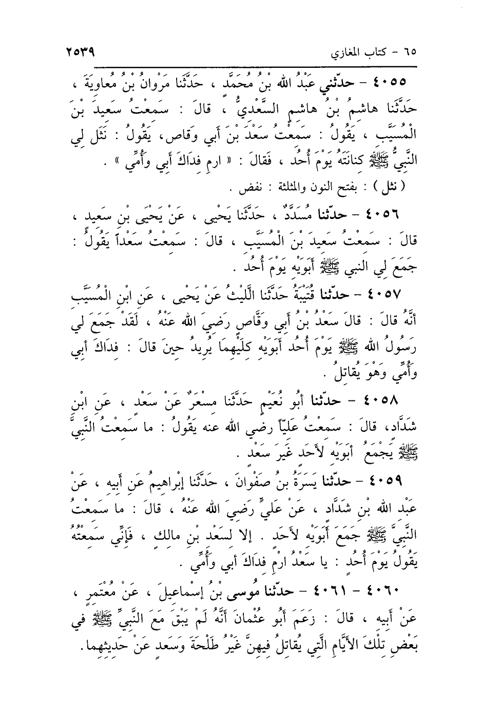 4056 - حَدَّثَنَا مُسَدَّدٌ، حَدَّثَنَا يَحْيَى، عَنْ يَحْيَى بْنِ سَعِيدٍ، قَالَ: سَمِعْتُ سَعِيدَ بْنَ المُسَيِّبِ، قَالَ: سَمِعْتُ سَعْدًا، يَقُولُ: «جَمَعَ لِي النَّبِيُّ صَلَّى اللهُ عَلَيْهِ وَسَلَّمَ، أَبَوَيْهِ يَوْمَ أُحُدٍ».