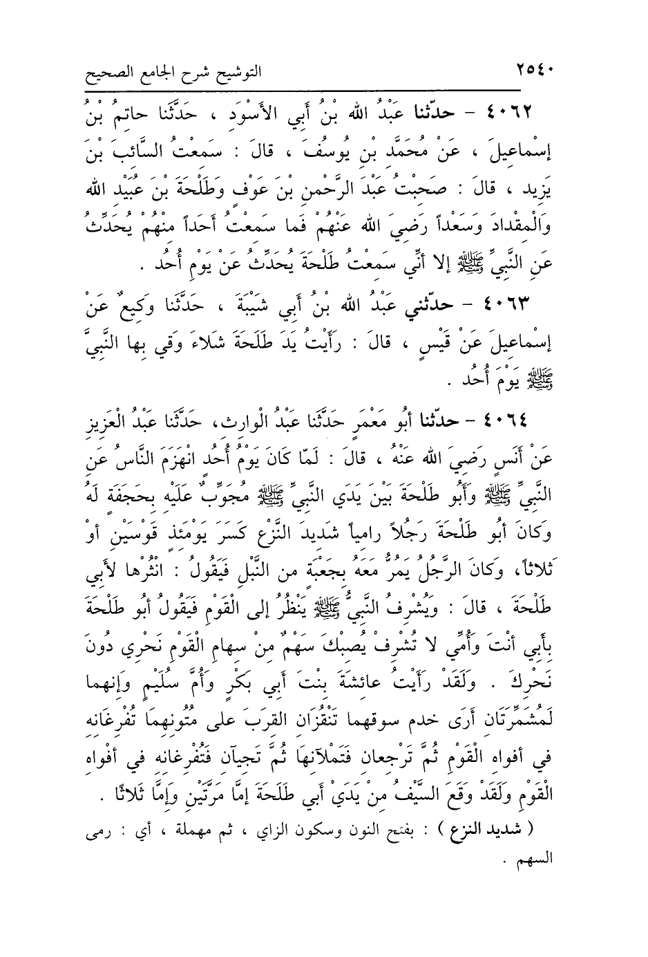 4063 - حَدَّثَنِي عَبْدُ اللَّهِ بْنُ أَبِي شَيْبَةَ، حَدَّثَنَا وَكِيعٌ، عَنْ إِسْمَاعِيلَ، عَنْ قَيْسٍ، قَالَ: «رَأَيْتُ يَدَ طَلْحَةَ شَلَّاءَ وَقَى بِهَا النَّبِيَّ صَلَّى اللهُ عَلَيْهِ وَسَلَّمَ يَوْمَ أُحُدٍ».