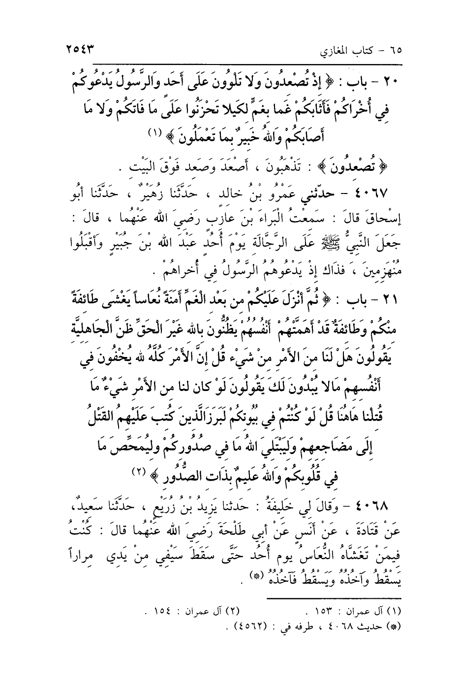 20 - بَابُ {إِذْ تُصْعِدُونَ وَلاَ تَلْوُونَ عَلَى أَحَدٍ وَالرَّسُولُ يَدْعُوكُمْ فِي أُخْرَاكُمْ فَأَثَابَكُمْ غَمًّا بِغَمٍّ لِكَيْلاَ تَحْزَنُوا عَلَى مَا فَاتَكُمْ وَلاَ مَا أَصَابَكُمْ وَاللَّهُ خَبِيرٌ بِمَا تَعْمَلُونَ} [آل عمران: 153] "