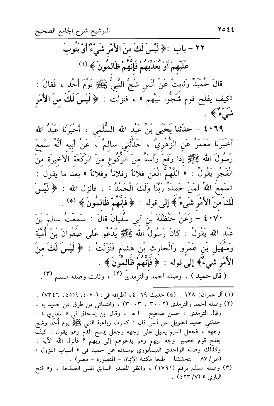 22 - بَابُ {لَيْسَ لَكَ مِنَ الأَمْرِ شَيْءٌ أَوْ يَتُوبَ عَلَيْهِمْ أَوْ يُعَذِّبَهُمْ فَإِنَّهُمْ ظَالِمُونَ} [آل عمران: 128]
