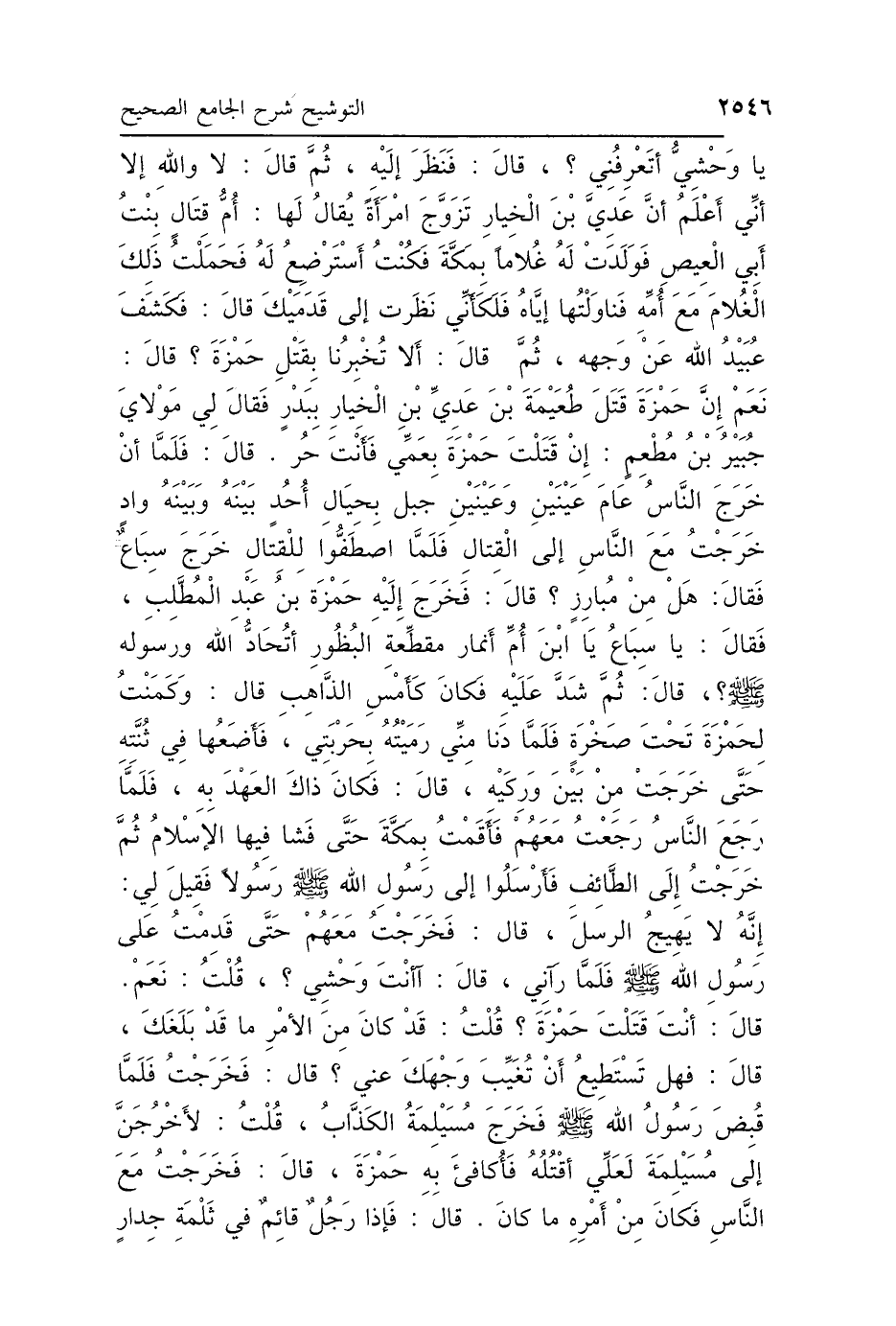 يَا وَحْشِيُّ أَتَعْرِفُنِي؟ قَالَ: فَنَظَرَ إِلَيْهِ ثُمَّ قَالَ: لاَ وَاللَّهِ، إِلَّا أَنِّي أَعْلَمُ أَنَّ عَدِيَّ بْنَ الخِيَارِ تَزَوَّجَ امْرَأَةً يُقَالُ لَهَا أُمُّ قِتَالٍ بِنْتُ أَبِي العِيصِ، فَوَلَدَتْ لَهُ غُلاَمًا بِمَكَّةَ، فَكُنْتُ أَسْتَرْضِعُ لَهُ، فَحَمَلْتُ ذَلِكَ الغُلاَمَ مَعَ أُمِّهِ فَنَاوَلْتُهَا إِيَّاهُ، فَلَكَأَنِّي نَظَرْتُ إِلَى قَدَمَيْكَ، قَالَ: فَكَشَفَ عُبَيْدُ اللَّهِ عَنْ وَجْهِهِ ثُمَّ قَالَ: أَلاَ تُخْبِرُنَا بِقَتْلِ حَمْزَةَ؟ قَالَ: نَعَمْ، إِنَّ حَمْزَةَ قَتَلَ طُعَيْمَةَ بْنَ عَدِيِّ بْنِ الخِيَارِ بِبَدْرٍ، فَقَالَ لِي مَوْلاَيَ جُبَيْرُ بْنُ مُطْعِمٍ: إِنْ قَتَلْتَ حَمْزَةَ بِعَمِّي فَأَنْتَ حُرٌّ، قَالَ: فَلَمَّا أَنْ خَرَجَ النَّاسُ عَامَ عَيْنَيْنِ، وَعَيْنَيْنِ جَبَلٌ بِحِيَالِ أُحُدٍ، بَيْنَهُ وَبَيْنَهُ وَادٍ، خَرَجْتُ مَعَ النَّاسِ إِلَى القِتَالِ، فَلَمَّا أَنِ اصْطَفُّوا لِلْقِتَالِ، خَرَجَ سِبَاعٌ فَقَالَ: هَلْ مِنْ مُبَارِزٍ؟ قَالَ: فَخَرَجَ إِلَيْهِ حَمْزَةُ بْنُ عَبْدِ المُطَّلِبِ، فَقَالَ: يَا سِبَاعُ، يَا ابْنَ أُمِّ أَنْمَارٍ مُقَطِّعَةِ البُظُورِ، أَتُحَادُّ اللَّهَ وَرَسُولَهُ صَلَّى اللهُ عَلَيْهِ وَسَلَّمَ؟ قَالَ: ثُمَّ شَدَّ عَلَيْهِ، فَكَانَ كَأَمْسِ الذَّاهِبِ، قَالَ: وَكَمَنْتُ لِحَمْزَةَ تَحْتَ صَخْرَةٍ، فَلَمَّا دَنَا مِنِّي رَمَيْتُهُ بِحَرْبَتِي، فَأَضَعُهَا فِي ثُنَّتِهِ حَتَّى خَرَجَتْ مِنْ بَيْنِ وَرِكَيْهِ، قَالَ: فَكَانَ ذَاكَ العَهْدَ بِهِ، فَلَمَّا رَجَعَ النَّاسُ رَجَعْتُ مَعَهُمْ، فَأَقَمْتُ بِمَكَّةَ حَتَّى فَشَا فِيهَا الإِسْلاَمُ، ثُمَّ خَرَجْتُ إِلَى الطَّائِفِ، فَأَرْسَلُوا إِلَى رَسُولِ اللَّهِ صَلَّى اللهُ عَلَيْهِ وَسَلَّمَ رَسُولًا، فَقِيلَ لِي: إِنَّهُ لاَ يَهِيجُ الرُّسُلَ، قَالَ: فَخَرَجْتُ مَعَهُمْ حَتَّى قَدِمْتُ عَلَى رَسُولِ اللَّهِ صَلَّى اللهُ عَلَيْهِ وَسَلَّمَ، فَلَمَّا رَآنِي قَالَ: «آنْتَ وَحْشِيٌّ» قُلْتُ: نَعَمْ، قَالَ: «أَنْتَ قَتَلْتَ حَمْزَةَ» قُلْتُ: قَدْ كَانَ مِنَ الأَمْرِ مَا بَلَغَكَ، قَالَ: «فَهَلْ تَسْتَطِيعُ أَنْ تُغَيِّبَ وَجْهَكَ عَنِّي» قَالَ: فَخَرَجْتُ فَلَمَّا قُبِضَ رَسُولُ اللَّهِ صَلَّى اللهُ عَلَيْهِ وَسَلَّمَ فَخَرَجَ مُسَيْلِمَةُ الكَذَّابُ، قُلْتُ: لَأَخْرُجَنَّ إِلَى مُسَيْلِمَةَ، لَعَلِّي أَقْتُلُهُ فَأُكَافِئَ بِهِ حَمْزَةَ، قَالَ: فَخَرَجْتُ مَعَ النَّاسِ، فَكَانَ مِنْ أَمْرِهِ مَا كَانَ، قَالَ: فَإِذَا رَجُلٌ قَائِمٌ فِي ثَلْمَةِ جِدَارٍ،