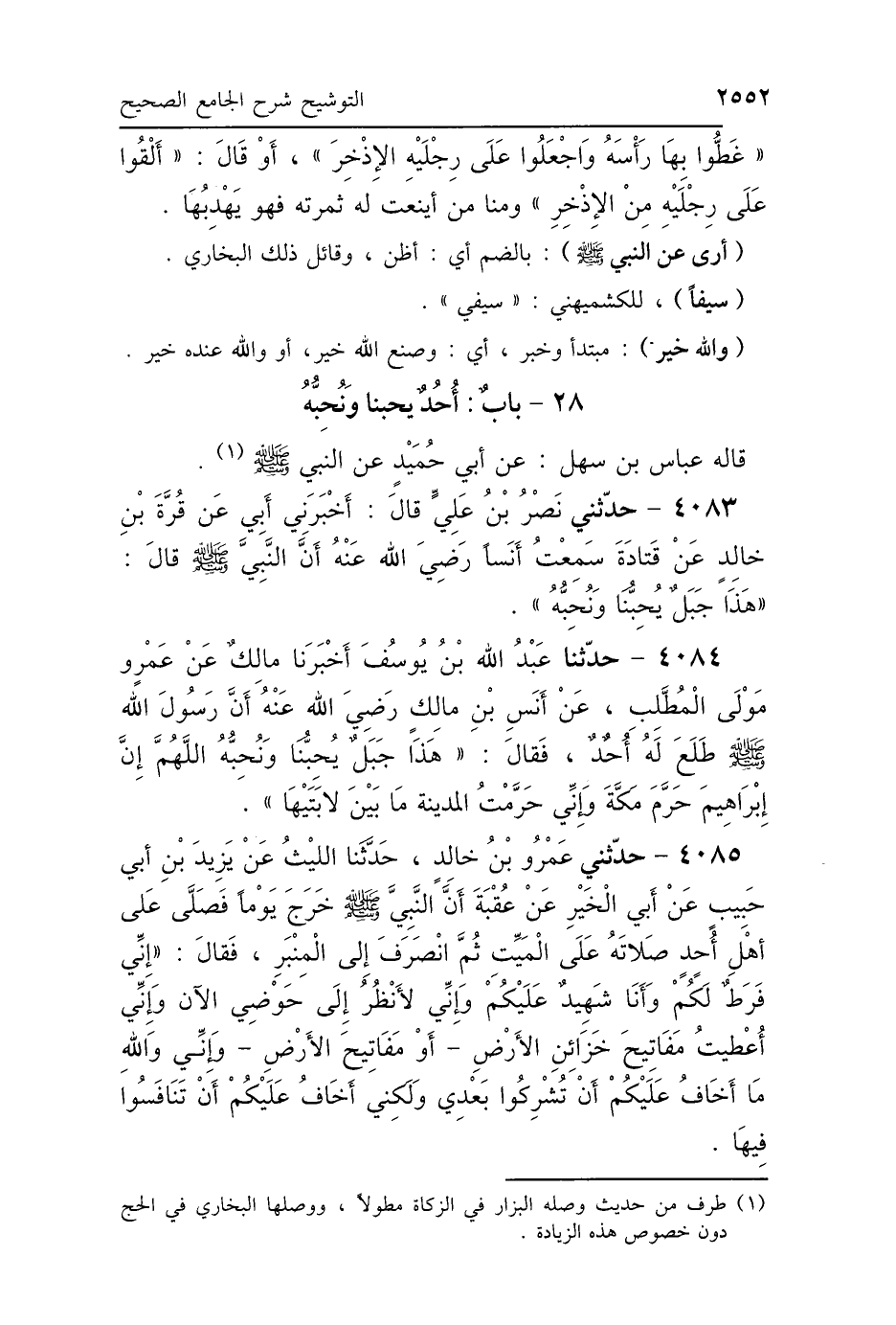 4083 - حَدَّثَنِي نَصْرُ بْنُ عَلِيٍّ، قَالَ: أَخْبَرَنِي أَبِي، عَنْ قُرَّةَ بْنِ خَالِدٍ، عَنْ قَتَادَةَ، سَمِعْتُ أَنَسًا رَضِيَ اللَّهُ عَنْهُ، أَنَّ النَّبِيَّ صَلَّى اللهُ عَلَيْهِ وَسَلَّمَ، قَالَ: «هَذَا جَبَلٌ يُحِبُّنَا وَنُحِبُّهُ».