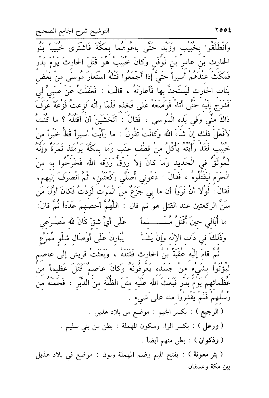 وَانْطَلَقُوا بِخُبَيْبٍ، وَزَيْدٍ حَتَّى بَاعُوهُمَا بِمَكَّةَ، فَاشْتَرَى خُبَيْبًا بَنُو الحَارِثِ بْنِ عَامِرِ بْنِ نَوْفَلٍ، وَكَانَ خُبَيْبٌ هُوَ قَتَلَ الحَارِثَ يَوْمَ بَدْرٍ، فَمَكَثَ عِنْدَهُمْ أَسِيرًا، حَتَّى إِذَا أَجْمَعُوا قَتْلَهُ، اسْتَعَارَ مُوسًى مِنْ بَعْضِ بَنَاتِ الحَارِثِ لِيَسْتَحِدَّ بِهَا فَأَعَارَتْهُ، قَالَتْ: فَغَفَلْتُ عَنْ صَبِيٍّ لِي، فَدَرَجَ إِلَيْهِ حَتَّى أَتَاهُ فَوَضَعَهُ عَلَى فَخِذِهِ، فَلَمَّا رَأَيْتُهُ فَزِعْتُ فَزْعَةً عَرَفَ ذَاكَ مِنِّي وَفِي يَدِهِ المُوسَى، فَقَالَ: أَتَخْشَيْنَ أَنْ أَقْتُلَهُ؟ مَا كُنْتُ لِأَفْعَلَ ذَاكِ إِنْ شَاءَ اللَّهُ، وَكَانَتْ تَقُولُ: مَا رَأَيْتُ أَسِيرًا قَطُّ خَيْرًا مِنْ خُبَيْبٍ، لَقَدْ رَأَيْتُهُ يَأْكُلُ مِنْ قِطْفِ عِنَبٍ وَمَا بِمَكَّةَ يَوْمَئِذٍ ثَمَرَةٌ، وَإِنَّهُ لَمُوثَقٌ فِي الحَدِيدِ، وَمَا كَانَ إِلَّا رِزْقٌ رَزَقَهُ اللَّهُ، فَخَرَجُوا بِهِ مِنَ الحَرَمِ لِيَقْتُلُوهُ، فَقَالَ: دَعُونِي أُصَلِّي رَكْعَتَيْنِ، ثُمَّ انْصَرَفَ إِلَيْهِمْ، فَقَالَ: لَوْلاَ أَنْ تَرَوْا أَنَّ مَا بِي جَزَعٌ مِنَ المَوْتِ لَزِدْتُ، فَكَانَ أَوَّلَ مَنْ سَنَّ الرَّكْعَتَيْنِ عِنْدَ القَتْلِ هُوَ، ثُمَّ قَالَ: اللَّهُمَّ أَحْصِهِمْ عَدَدًا، ثُمَّ قَالَ: