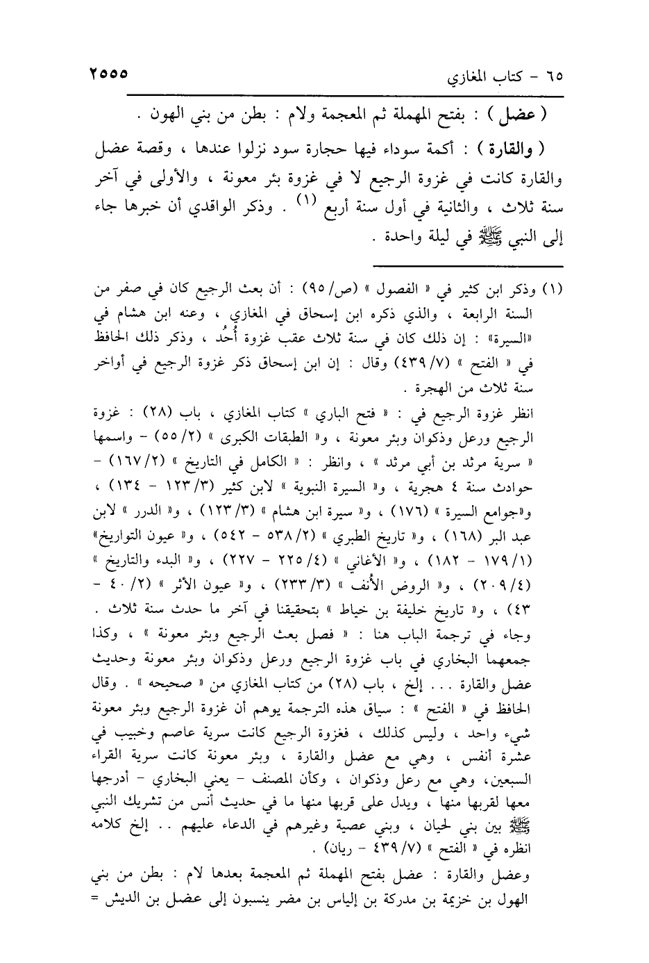 (والقارة): أكمة سوداء فيها حجارة سود نزلوا عندها، وقصة عضل والقارة كانت في غزوة الرجيع لا في غزوة بئر معونة، والأولى في آخر سنة ثلاث، والثانية في أول سنة أربع (1). وذكر الواقدي أن خبرها جاء إلى النبي - صلى الله عليه وسلم - في ليلة واحدة.