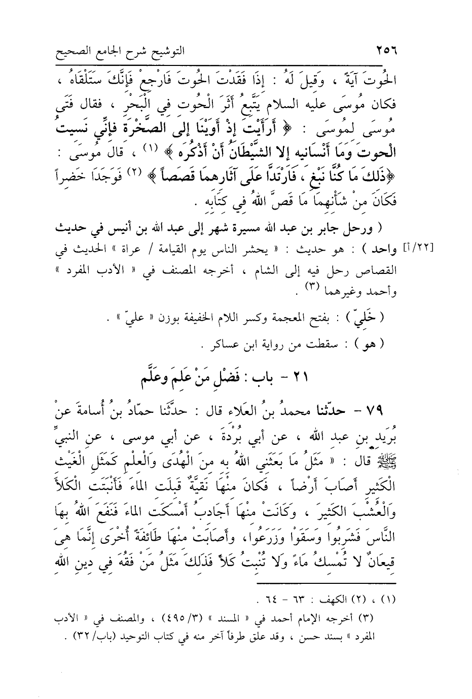 الحُوتَ آيَةً، وَقِيلَ لَهُ: إِذَا فَقَدْتَ الحُوتَ فَارْجِعْ، فَإِنَّكَ سَتَلْقَاهُ، فَكَانَ مُوسَى صَلَّى اللَّهُ عَلَيْهِ يَتَّبِعُ أَثَرَ الحُوتِ فِي البَحْرِ، فَقَالَ فَتَى مُوسَى لِمُوسَى: (أَرَأَيْتَ إِذْ أَوَيْنَا إِلَى الصَّخْرَةِ فَإِنِّي نَسِيتُ الحُوتَ وَمَا أَنْسَانِيهِ إِلَّا الشَّيْطَانُ أَنْ أَذْكُرَهُ)، قَالَ مُوسَى: (ذَلِكَ مَا كُنَّا نَبْغِي فَارْتَدَّا عَلَى آثَارِهِمَا قَصَصًا)، فَوَجَدَا خَضِرًا، فَكَانَ مِنْ شَأْنِهِمَا مَا قَصَّ اللَّهُ فِي كِتَابِهِ".
