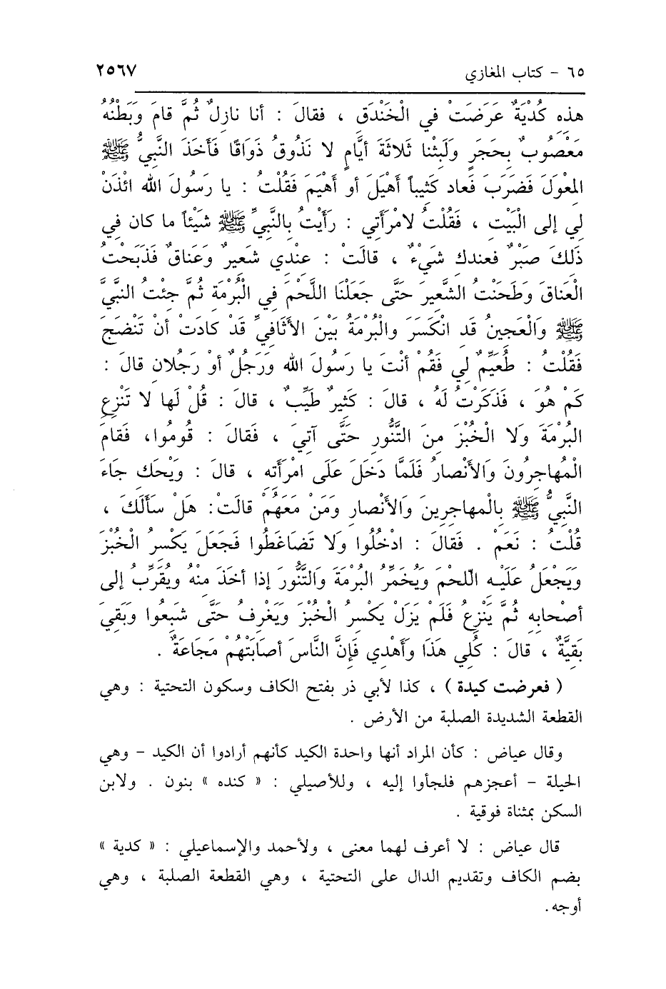 هَذِهِ كُدْيَةٌ عَرَضَتْ فِي الخَنْدَقِ، فَقَالَ: «أَنَا نَازِلٌ». ثُمَّ قَامَ وَبَطْنُهُ مَعْصُوبٌ بِحَجَرٍ، وَلَبِثْنَا ثَلاَثَةَ أَيَّامٍ لاَ نَذُوقُ ذَوَاقًا، فَأَخَذَ النَّبِيُّ صَلَّى اللهُ عَلَيْهِ وَسَلَّمَ المِعْوَلَ فَضَرَبَ، فَعَادَ كَثِيبًا أَهْيَلَ، أَوْ أَهْيَمَ، فَقُلْتُ: يَا رَسُولَ اللَّهِ، ائْذَنْ لِي إِلَى البَيْتِ، فَقُلْتُ لِامْرَأَتِي: رَأَيْتُ بِالنَّبِيِّ صَلَّى اللهُ عَلَيْهِ وَسَلَّمَ شَيْئًا مَا كَانَ فِي ذَلِكَ صَبْرٌ، فَعِنْدَكِ شَيْءٌ؟ قَالَتْ: عِنْدِي شَعِيرٌ وَعَنَاقٌ، فَذَبَحَتِ العَنَاقَ، وَطَحَنَتِ الشَّعِيرَ حَتَّى جَعَلْنَا اللَّحْمَ فِي البُرْمَةِ، ثُمَّ جِئْتُ النَّبِيَّ صَلَّى اللهُ عَلَيْهِ وَسَلَّمَ وَالعَجِينُ قَدْ انْكَسَرَ، وَالبُرْمَةُ بَيْنَ الأَثَافِيِّ قَدْ كَادَتْ أَنْ تَنْضَجَ، فَقُلْتُ: طُعَيِّمٌ لِي، فَقُمْ أَنْتَ يَا رَسُولَ اللَّهِ وَرَجُلٌ أَوْ رَجُلاَنِ، قَالَ: «كَمْ هُوَ» فَذَكَرْتُ لَهُ، قَالَ: " كَثِيرٌ طَيِّبٌ، قَالَ: قُلْ لَهَا: لاَ تَنْزِعِ البُرْمَةَ، وَلاَ الخُبْزَ مِنَ التَّنُّورِ حَتَّى آتِيَ، فَقَالَ: قُومُوا " فَقَامَ المُهَاجِرُونَ، وَالأَنْصَارُ، فَلَمَّا دَخَلَ عَلَى امْرَأَتِهِ قَالَ: وَيْحَكِ جَاءَ النَّبِيُّ صَلَّى اللهُ عَلَيْهِ وَسَلَّمَ بِالْمُهَاجِرِينَ وَالأَنْصَارِ وَمَنْ مَعَهُمْ، قَالَتْ: هَلْ سَأَلَكَ؟ قُلْتُ: نَعَمْ، فَقَالَ: «ادْخُلُوا وَلاَ تَضَاغَطُوا» فَجَعَلَ يَكْسِرُ الخُبْزَ، وَيَجْعَلُ عَلَيْهِ اللَّحْمَ، وَيُخَمِّرُ البُرْمَةَ وَالتَّنُّورَ إِذَا أَخَذَ مِنْهُ، وَيُقَرِّبُ إِلَى أَصْحَابِهِ ثُمَّ يَنْزِعُ، فَلَمْ يَزَلْ يَكْسِرُ الخُبْزَ، وَيَغْرِفُ حَتَّى شَبِعُوا وَبَقِيَ بَقِيَّةٌ، قَالَ: «كُلِي هَذَا وَأَهْدِي، فَإِنَّ النَّاسَ أَصَابَتْهُمْ مَجَاعَةٌ».