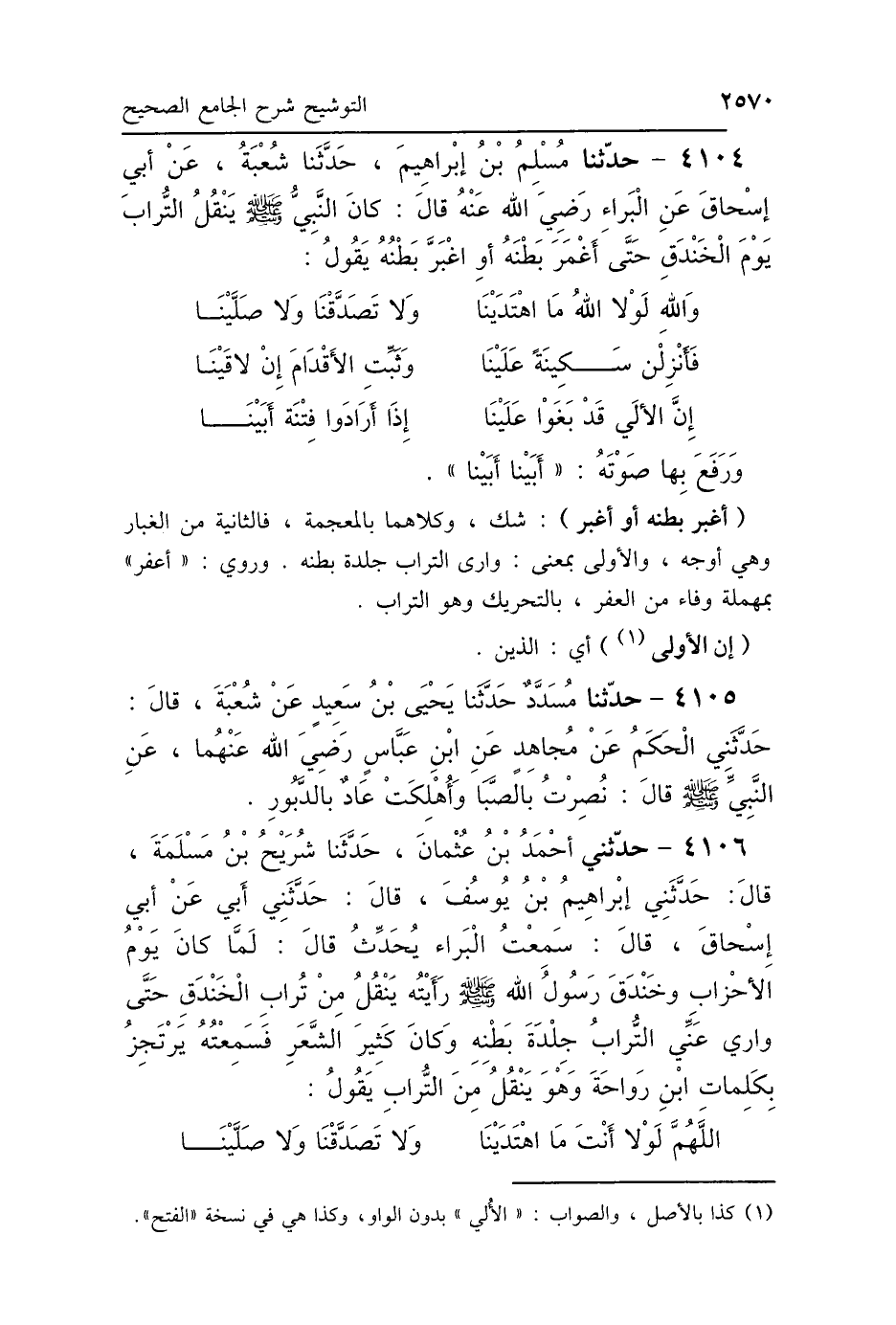 4104 - حَدَّثَنَا مُسْلِمُ بْنُ إِبْرَاهِيمَ، حَدَّثَنَا شُعْبَةُ، عَنْ أَبِي إِسْحَاقَ، عَنِ البَرَاءِ رَضِيَ اللَّهُ عَنْهُ، قَالَ: كَانَ النَّبِيُّ صَلَّى اللهُ عَلَيْهِ وَسَلَّمَ يَنْقُلُ التُّرَابَ يَوْمَ الخَنْدَقِ، حَتَّى أَغْمَرَ بَطْنَهُ، أَوْ اغْبَرَّ بَطْنُهُ، يَقُولُ: «وَاللَّهِ لَوْلاَ اللَّهُ مَا اهْتَدَيْنَا، وَلاَ تَصَدَّقْنَا وَلاَ صَلَّيْنَا، فَأَنْزِلَنْ سَكِينَةً عَلَيْنَا، وَثَبِّتِ الأَقْدَامَ إِنْ لاَقَيْنَا، إِنَّ الأُلَى قَدْ بَغَوْا عَلَيْنَا، إِذَا أَرَادُوا فِتْنَةً أَبَيْنَا» وَرَفَعَ بِهَا صَوْتَهُ: «أَبَيْنَا أَبَيْنَا».