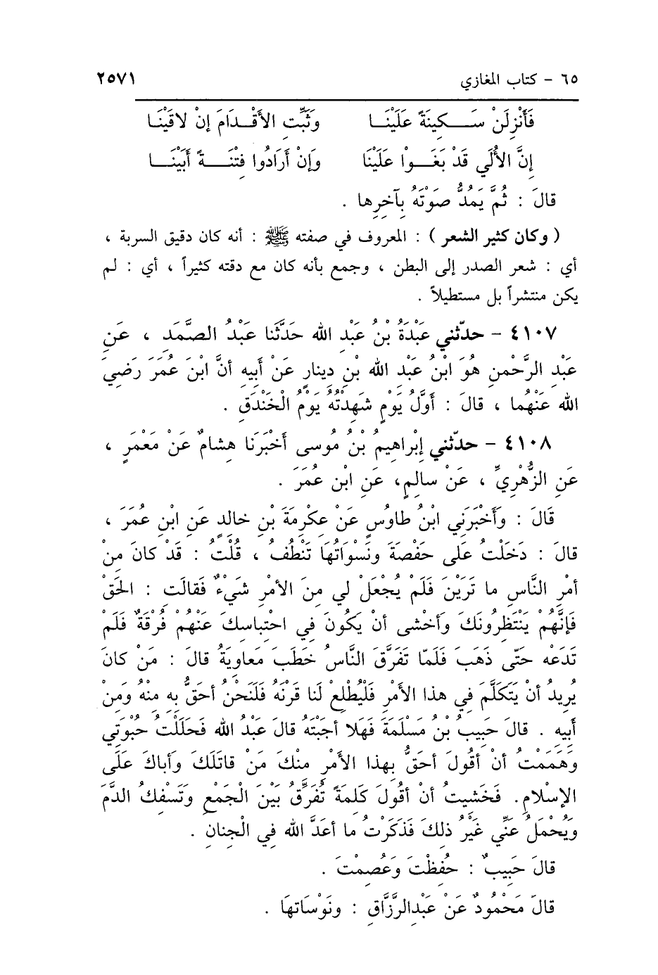 4108 - حَدَّثَنِي إِبْرَاهِيمُ بْنُ مُوسَى، أَخْبَرَنَا هِشَامٌ، عَنْ مَعْمَرٍ، عَنِ الزُّهْرِيِّ، عَنْ سَالِمٍ، عَنِ ابْنِ عُمَرَ، قَالَ: وَأَخْبَرَنِي ابْنُ طَاوُسٍ، عَنْ عِكْرِمَةَ بْنِ خَالِدٍ، عَنِ ابْنِ عُمَرَ، قَالَ: " دَخَلْتُ عَلَى حَفْصَةَ وَنَسْوَاتُهَا تَنْطُفُ، قُلْتُ: قَدْ كَانَ مِنْ أَمْرِ النَّاسِ مَا تَرَيْنَ، فَلَمْ يُجْعَلْ لِي مِنَ الأَمْرِ شَيْءٌ، فَقَالَتْ: الحَقْ فَإِنَّهُمْ يَنْتَظِرُونَكَ، وَأَخْشَى أَنْ يَكُونَ فِي احْتِبَاسِكَ عَنْهُمْ فُرْقَةٌ، فَلَمْ تَدَعْهُ حَتَّى ذَهَبَ، فَلَمَّا تَفَرَّقَ النَّاسُ خَطَبَ مُعَاوِيَةُ قَالَ: مَنْ كَانَ يُرِيدُ أَنْ يَتَكَلَّمَ فِي هَذَا الأَمْرِ فَلْيُطْلِعْ لَنَا قَرْنَهُ، فَلَنَحْنُ أَحَقُّ بِهِ مِنْهُ وَمِنْ أَبِيهِ، قَالَ حَبِيبُ بْنُ مَسْلَمَةَ: فَهَلَّا أَجَبْتَهُ؟ قَالَ عَبْدُ اللَّهِ: فَحَلَلْتُ حُبْوَتِي، وَهَمَمْتُ أَنْ أَقُولَ: أَحَقُّ بِهَذَا الأَمْرِ مِنْكَ مَنْ قَاتَلَكَ وَأَبَاكَ عَلَى الإِسْلاَمِ، فَخَشِيتُ أَنْ أَقُولَ كَلِمَةً تُفَرِّقُ بَيْنَ الجَمْعِ، وَتَسْفِكُ الدَّمَ، وَيُحْمَلُ عَنِّي غَيْرُ ذَلِكَ، فَذَكَرْتُ مَا أَعَدَّ اللَّهُ فِي الجِنَانِ، قَالَ حَبِيبٌ: حُفِظْتَ وَعُصِمْتَ " قَالَ مَحْمُودٌ، عَنْ عَبْدِ الرَّزَّاقِ وَنَوْسَاتُهَا.