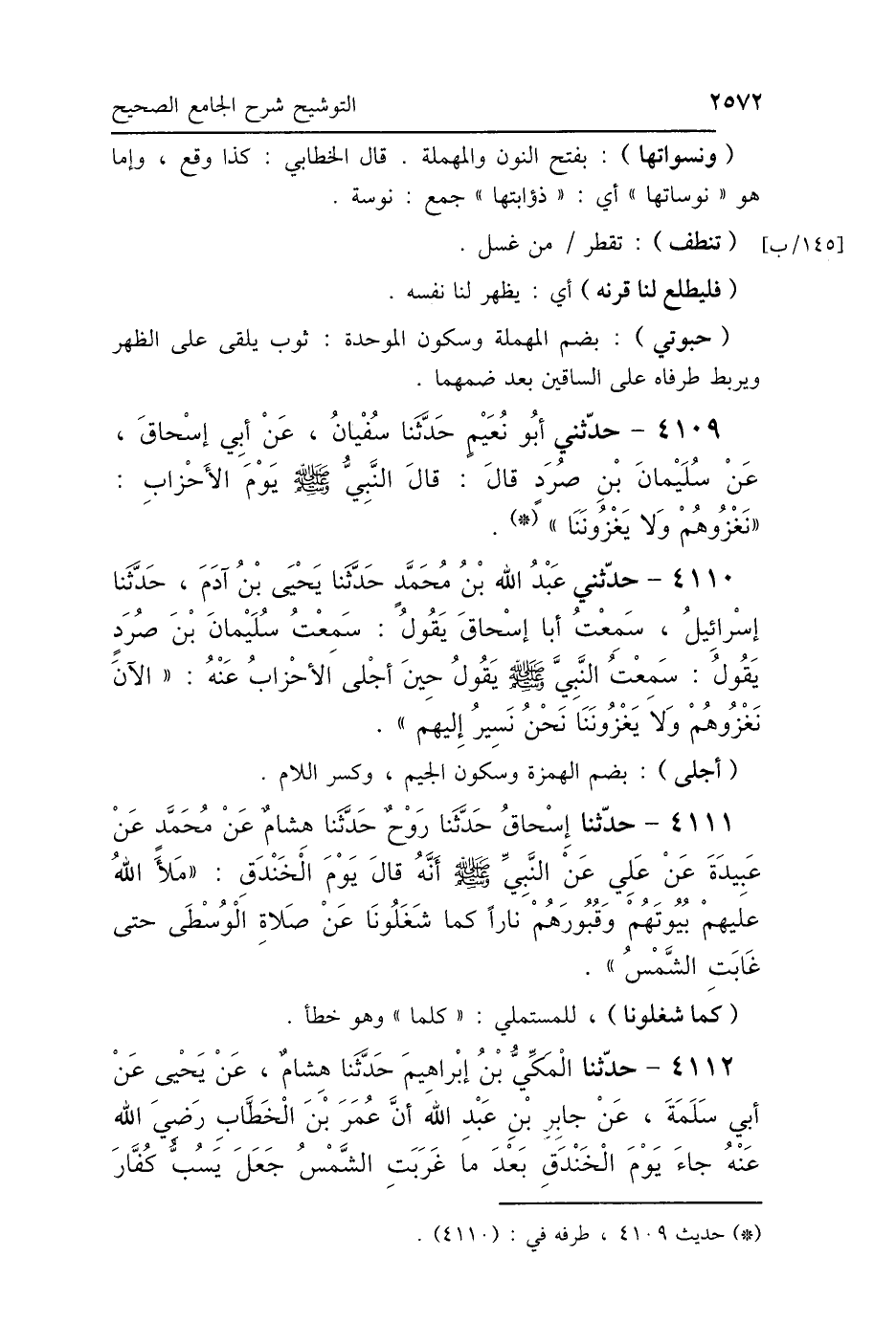 4109 - حَدَّثَنَا أَبُو نُعَيْمٍ، حَدَّثَنَا سُفْيَانُ، عَنْ أَبِي إِسْحَاقَ، عَنْ سُلَيْمَانَ بْنِ صُرَدٍ، قَالَ: قَالَ النَّبِيُّ صَلَّى اللهُ عَلَيْهِ وَسَلَّمَ يَوْمَ الْأَحْزَابِ: «نَغْزُوهُمْ، وَلاَ يَغْزُونَنَا».