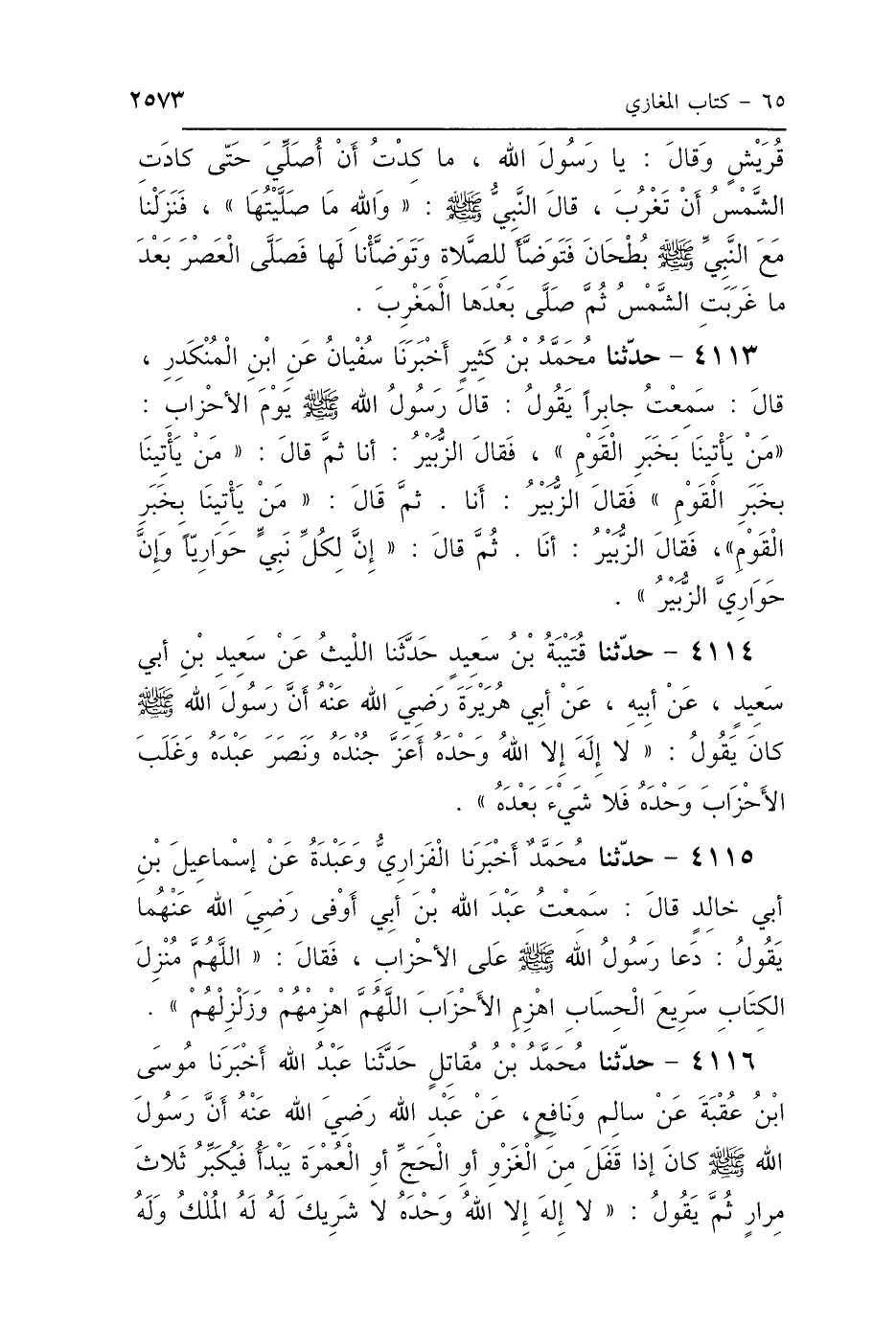 4113 - حَدَّثَنَا مُحَمَّدُ بْنُ كَثِيرٍ، أَخْبَرَنَا سُفْيَانُ، عَنِ ابْنِ المُنْكَدِرِ، قَالَ: سَمِعْتُ جَابِرًا، يَقُولُ: قَالَ رَسُولُ اللَّهِ صَلَّى اللهُ عَلَيْهِ وَسَلَّمَ يَوْمَ الأَحْزَابِ: «مَنْ يَأْتِينَا بِخَبَرِ القَوْمِ» فَقَالَ الزُّبَيْرُ: أَنَا، ثُمَّ قَالَ: «مَنْ يَأْتِينَا بِخَبَرِ القَوْمِ». فَقَالَ الزُّبَيْرُ: أَنَا، ثُمَّ قَالَ: «مَنْ يَأْتِينَا بِخَبَرِ القَوْمِ» فَقَالَ الزُّبَيْرُ: أَنَا، ثُمَّ قَالَ: «إِنَّ لِكُلِّ نَبِيٍّ حَوَارِيَّ، وَإِنَّ حَوَارِيَّ الزُّبَيْرُ».