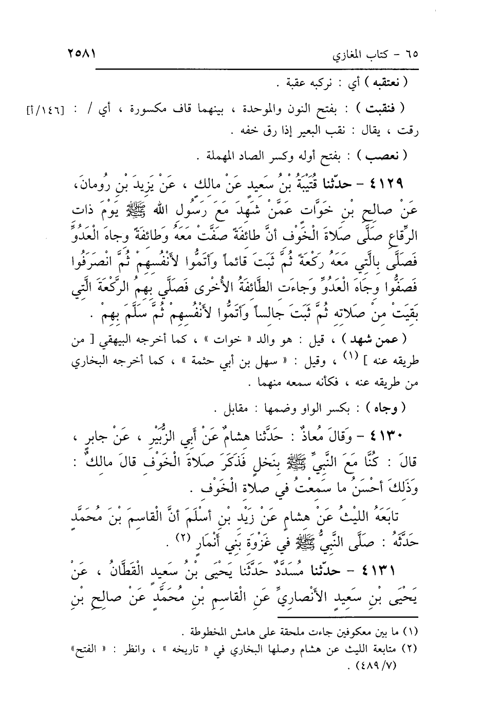 4129 - حَدَّثَنَا قُتَيْبَةُ بْنُ سَعِيدٍ، عَنْ مَالِكٍ، عَنْ يَزِيدَ بْنِ رُومَانَ، عَنْ صَالِحِ بْنِ خَوَّاتٍ، عَمَّنْ شَهِدَ " رَسُولَ اللَّهِ صَلَّى اللهُ عَلَيْهِ وَسَلَّمَ يَوْمَ ذَاتِ الرِّقَاعِ صَلَّى صَلاَةَ الخَوْفِ: أَنَّ طَائِفَةً صَفَّتْ مَعَهُ، وَطَائِفَةٌ وِجَاهَ العَدُوِّ، فَصَلَّى بِالَّتِي مَعَهُ رَكْعَةً، ثُمَّ ثَبَتَ قَائِمًا، وَأَتَمُّوا لِأَنْفُسِهِمْ ثُمَّ انْصَرَفُوا، فَصَفُّوا وِجَاهَ العَدُوِّ، وَجَاءَتِ الطَّائِفَةُ الأُخْرَى فَصَلَّى بِهِمُ الرَّكْعَةَ الَّتِي بَقِيَتْ مِنْ صَلاَتِهِ ثُمَّ ثَبَتَ جَالِسًا، وَأَتَمُّوا لِأَنْفُسِهِمْ، ثُمَّ سَلَّمَ بِهِمْ".