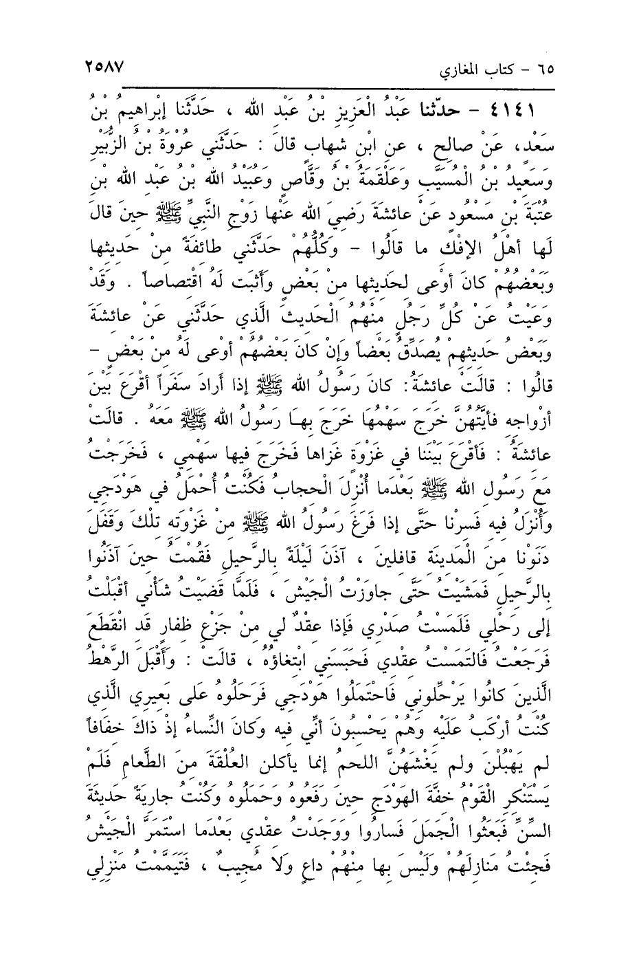 4141 - حَدَّثَنَا عَبْدُ العَزِيزِ بْنُ عَبْدِ اللَّهِ، حَدَّثَنَا إِبْرَاهِيمُ بْنُ سَعْدٍ، عَنْ صَالِحٍ، عَنِ ابْنِ شِهَابٍ، قَالَ: حَدَّثَنِي عُرْوَةُ بْنُ الزُّبَيْرِ، وَسَعِيدُ بْنُ المُسَيِّبِ، وَعَلْقَمَةُ بْنُ وَقَّاصٍ، وَعُبَيْدُ اللَّهِ بْنُ عَبْدِ اللَّهِ بْنِ عُتْبَةَ بْنِ مَسْعُودٍ، عَنْ عَائِشَةَ رَضِيَ اللَّهُ عَنْهَا، زَوْجِ النَّبِيِّ صَلَّى اللهُ عَلَيْهِ وَسَلَّمَ، حِينَ قَالَ لَهَا: أَهْلُ الإِفْكِ مَا قَالُوا، وَكُلُّهُمْ حَدَّثَنِي طَائِفَةً مِنْ حَدِيثِهَا، وَبَعْضُهُمْ كَانَ أَوْعَى لِحَدِيثِهَا مِنْ بَعْضٍ، وَأَثْبَتَ لَهُ اقْتِصَاصًا، وَقَدْ وَعَيْتُ عَنْ كُلِّ رَجُلٍ مِنْهُمُ الحَدِيثَ الَّذِي حَدَّثَنِي عَنْ عَائِشَةَ، وَبَعْضُ حَدِيثِهِمْ يُصَدِّقُ بَعْضًا، وَإِنْ كَانَ بَعْضُهُمْ أَوْعَى لَهُ مِنْ بَعْضٍ، قَالُوا: قَالَتْ عَائِشَةُ: كَانَ رَسُولُ اللَّهِ صَلَّى اللهُ عَلَيْهِ وَسَلَّمَ إِذَا أَرَادَ سَفَرًا أَقْرَعَ بَيْنَ أَزْوَاجِهِ، فَأَيُّهُنَّ خَرَجَ سَهْمُهَا خَرَجَ بِهَا رَسُولُ اللَّهِ صَلَّى اللهُ عَلَيْهِ وَسَلَّمَ مَعَهُ، قَالَتْ عَائِشَةُ: فَأَقْرَعَ بَيْنَنَا فِي غَزْوَةٍ غَزَاهَا فَخَرَجَ فِيهَا سَهْمِي، فَخَرَجْتُ مَعَ رَسُولِ اللَّهِ صَلَّى اللهُ عَلَيْهِ وَسَلَّمَ بَعْدَ مَا أُنْزِلَ الحِجَابُ، فَكُنْتُ أُحْمَلُ فِي هَوْدَجِي وَأُنْزَلُ فِيهِ، فَسِرْنَا حَتَّى إِذَا فَرَغَ رَسُولُ اللَّهِ صَلَّى اللهُ عَلَيْهِ وَسَلَّمَ مِنْ غَزْوَتِهِ تِلْكَ وَقَفَلَ، دَنَوْنَا مِنَ المَدِينَةِ قَافِلِينَ، آذَنَ لَيْلَةً بِالرَّحِيلِ، فَقُمْتُ حِينَ آذَنُوا بِالرَّحِيلِ، فَمَشَيْتُ حَتَّى جَاوَزْتُ الجَيْشَ، فَلَمَّا قَضَيْتُ شَأْنِي أَقْبَلْتُ إِلَى رَحْلِي، فَلَمَسْتُ صَدْرِي، فَإِذَا عِقْدٌ لِي مِنْ جَزْعِ ظَفَارِ قَدِ انْقَطَعَ، فَرَجَعْتُ فَالْتَمَسْتُ عِقْدِي فَحَبَسَنِي ابْتِغَاؤُهُ، قَالَتْ: وَأَقْبَلَ الرَّهْطُ الَّذِينَ كَانُوا يُرَحِّلُونِي، فَاحْتَمَلُوا هَوْدَجِي فَرَحَلُوهُ عَلَى بَعِيرِي الَّذِي كُنْتُ أَرْكَبُ عَلَيْهِ، وَهُمْ يَحْسِبُونَ أَنِّي فِيهِ، وَكَانَ النِّسَاءُ إِذْ ذَاكَ خِفَافًا لَمْ يَهْبُلْنَ، وَلَمْ يَغْشَهُنَّ اللَّحْمُ، إِنَّمَا يَأْكُلْنَ العُلْقَةَ مِنَ الطَّعَامِ، فَلَمْ يَسْتَنْكِرِ القَوْمُ خِفَّةَ الهَوْدَجِ حِينَ رَفَعُوهُ وَحَمَلُوهُ، وَكُنْتُ جَارِيَةً حَدِيثَةَ السِّنِّ، فَبَعَثُوا الجَمَلَ فَسَارُوا، وَوَجَدْتُ عِقْدِي بَعْدَ مَا اسْتَمَرَّ الجَيْشُ، فَجِئْتُ مَنَازِلَهُمْ وَلَيْسَ بِهَا مِنْهُمْ دَاعٍ وَلاَ مُجِيبٌ، فَتَيَمَّمْتُ مَنْزِلِي