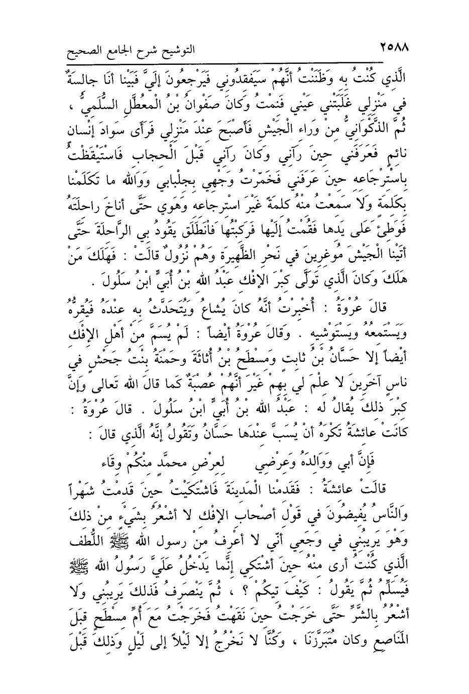 الَّذِي كُنْتُ بِهِ، وَظَنَنْتُ أَنَّهُمْ سَيَفْقِدُونِي فَيَرْجِعُونَ إِلَيَّ، فَبَيْنَا أَنَا جَالِسَةٌ فِي مَنْزِلِي، غَلَبَتْنِي عَيْنِي فَنِمْتُ، وَكَانَ صَفْوَانُ بْنُ المُعَطَّلِ السُّلَمِيُّ ثُمَّ الذَّكْوَانِيُّ مِنْ وَرَاءِ الجَيْشِ، فَأَصْبَحَ عِنْدَ مَنْزِلِي، فَرَأَى سَوَادَ إِنْسَانٍ نَائِمٍ فَعَرَفَنِي حِينَ رَآنِي، وَكَانَ رَآنِي قَبْلَ الحِجَابِ، فَاسْتَيْقَظْتُ بِاسْتِرْجَاعِهِ حِينَ عَرَفَنِي، فَخَمَّرْتُ وَجْهِي بِجِلْبَابِي، وَوَاللَّهِ مَا تَكَلَّمْنَا بِكَلِمَةٍ، وَلاَ سَمِعْتُ مِنْهُ كَلِمَةً غَيْرَ اسْتِرْجَاعِهِ، وَهَوَى حَتَّى أَنَاخَ رَاحِلَتَهُ، فَوَطِئَ عَلَى يَدِهَا، فَقُمْتُ إِلَيْهَا فَرَكِبْتُهَا، فَانْطَلَقَ يَقُودُ بِي الرَّاحِلَةَ حَتَّى أَتَيْنَا الجَيْشَ مُوغِرِينَ فِي نَحْرِ الظَّهِيرَةِ وَهُمْ نُزُولٌ، قَالَتْ: فَهَلَكَ مَنْ هَلَكَ، وَكَانَ الَّذِي تَوَلَّى كِبْرَ الإِفْكِ عَبْدُ اللَّهِ بْنُ أُبَيٍّ ابْنُ سَلُولَ، قَالَ عُرْوَةُ: أُخْبِرْتُ أَنَّهُ كَانَ يُشَاعُ وَيُتَحَدَّثُ بِهِ عِنْدَهُ، فَيُقِرُّهُ وَيَسْتَمِعُهُ وَيَسْتَوْشِيهِ، وَقَالَ عُرْوَةُ أَيْضًا: لَمْ يُسَمَّ مِنْ أَهْلِ الإِفْكِ أَيْضًا إِلَّا حَسَّانُ بْنُ ثَابِتٍ، وَمِسْطَحُ بْنُ أُثَاثَةَ، وَحَمْنَةُ بِنْتُ جَحْشٍ، فِي نَاسٍ آخَرِينَ لاَ عِلْمَ لِي بِهِمْ، غَيْرَ أَنَّهُمْ عُصْبَةٌ، كَمَا قَالَ اللَّهُ تَعَالَى، وَإِنَّ كِبْرَ ذَلِكَ يُقَالُ لَهُ: عَبْدُ اللَّهِ بْنُ أُبَيٍّ ابْنُ سَلُولَ، قَالَ عُرْوَةُ: كَانَتْ عَائِشَةُ تَكْرَهُ أَنْ يُسَبَّ عِنْدَهَا حَسَّانُ، وَتَقُولُ: إِنَّهُ الَّذِي قَالَ: