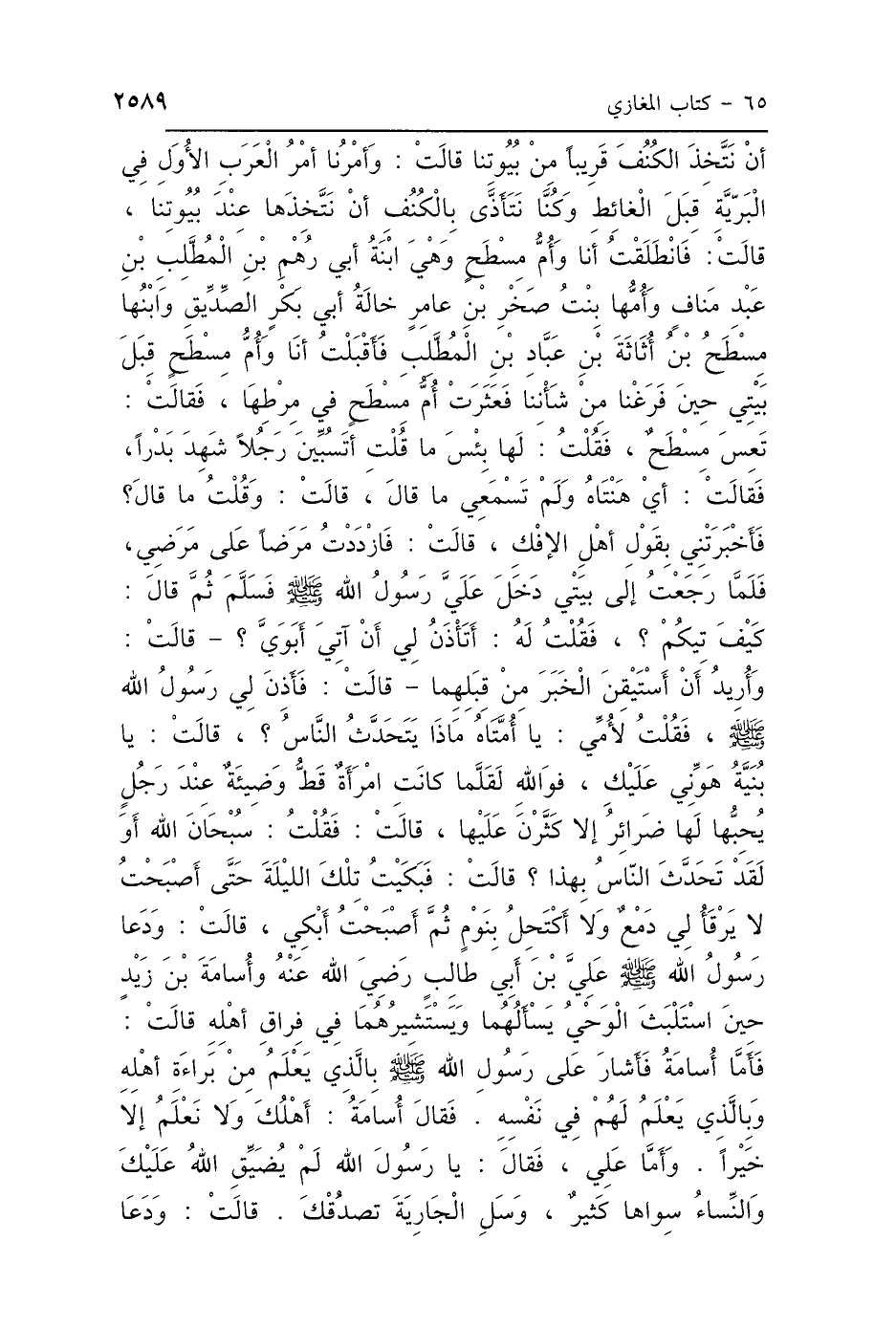 أَنْ نَتَّخِذَ الكُنُفَ قَرِيبًا مِنْ بُيُوتِنَا، قَالَتْ: وَأَمْرُنَا أَمْرُ العَرَبِ الأُوَلِ فِي البَرِّيَّةِ قِبَلَ الغَائِطِ، وَكُنَّا نَتَأَذَّى بِالكُنُفِ أَنْ نَتَّخِذَهَا عِنْدَ بُيُوتِنَا، قَالَتْ: فَانْطَلَقْتُ أَنَا وَأُمُّ مِسْطَحٍ، وَهِيَ ابْنَةُ أَبِي رُهْمِ بْنِ المُطَّلِبِ بْنِ عَبْدِ مَنَافٍ، وَأُمُّهَا بِنْتُ صَخْرِ بْنِ عَامِرٍ، خَالَةُ أَبِي بَكْرٍ الصِّدِّيقِ، وَابْنُهَا مِسْطَحُ بْنُ أُثَاثَةَ بْنِ عَبَّادِ بْنِ المُطَّلِبِ، فَأَقْبَلْتُ أَنَا وَأُمُّ مِسْطَحٍ قِبَلَ بَيْتِي حِينَ فَرَغْنَا مِنْ شَأْنِنَا، فَعَثَرَتْ أُمُّ مِسْطَحٍ فِي مِرْطِهَا فَقَالَتْ: تَعِسَ مِسْطَحٌ، فَقُلْتُ لَهَا: بِئْسَ مَا قُلْتِ، أَتَسُبِّينَ رَجُلًا شَهِدَ بَدْرًا؟ فَقَالَتْ: أَيْ هَنْتَاهْ وَلَمْ تَسْمَعِي مَا قَالَ؟ قَالَتْ: وَقُلْتُ: مَا قَالَ؟ فَأَخْبَرَتْنِي بِقَوْلِ أَهْلِ الإِفْكِ، قَالَتْ: فَازْدَدْتُ مَرَضًا عَلَى مَرَضِي، فَلَمَّا رَجَعْتُ إِلَى بَيْتِي دَخَلَ عَلَيَّ رَسُولُ اللَّهِ صَلَّى اللهُ عَلَيْهِ وَسَلَّمَ فَسَلَّمَ، ثُمَّ قَالَ: «كَيْفَ تِيكُمْ»، فَقُلْتُ لَهُ: أَتَأْذَنُ لِي أَنْ آتِيَ أَبَوَيَّ؟ قَالَتْ: وَأُرِيدُ أَنْ أَسْتَيْقِنَ الخَبَرَ مِنْ قِبَلِهِمَا، قَالَتْ: فَأَذِنَ لِي رَسُولُ اللَّهِ صَلَّى اللهُ عَلَيْهِ وَسَلَّمَ، فَقُلْتُ لِأُمِّي: يَا أُمَّتَاهُ، مَاذَا يَتَحَدَّثُ النَّاسُ؟ قَالَتْ: يَا بُنَيَّةُ، هَوِّنِي عَلَيْكِ، فَوَاللَّهِ لَقَلَّمَا كَانَتِ امْرَأَةٌ قَطُّ وَضِيئَةً عِنْدَ رَجُلٍ يُحِبُّهَا، لَهَا ضَرَائِرُ، إِلَّا كَثَّرْنَ عَلَيْهَا، قَالَتْ: فَقُلْتُ: سُبْحَانَ اللَّهِ، أَوَلَقَدْ تَحَدَّثَ النَّاسُ بِهَذَا؟ قَالَتْ: فَبَكَيْتُ تِلْكَ اللَّيْلَةَ حَتَّى أَصْبَحْتُ لاَ يَرْقَأُ لِي دَمْعٌ وَلاَ أَكْتَحِلُ بِنَوْمٍ، ثُمَّ أَصْبَحْتُ أَبْكِي، قَالَتْ: وَدَعَا رَسُولُ اللَّهِ صَلَّى اللهُ عَلَيْهِ وَسَلَّمَ عَلِيَّ بْنَ أَبِي طَالِبٍ وَأُسَامَةَ بْنَ زَيْدٍ حِينَ اسْتَلْبَثَ الوَحْيُ، يَسْأَلُهُمَا وَيَسْتَشِيرُهُمَا فِي فِرَاقِ أَهْلِهِ، قَالَتْ: فَأَمَّا أُسَامَةُ فَأَشَارَ عَلَى رَسُولِ اللَّهِ صَلَّى اللهُ عَلَيْهِ وَسَلَّمَ بِالَّذِي يَعْلَمُ مِنْ بَرَاءَةِ أَهْلِهِ، وَبِالَّذِي يَعْلَمُ لَهُمْ فِي نَفْسِهِ، فَقَالَ أُسَامَةُ: أَهْلَكَ، وَلاَ نَعْلَمُ إِلَّا خَيْرًا، وَأَمَّا عَلِيٌّ فَقَالَ: يَا رَسُولَ اللَّهِ، لَمْ يُضَيِّقِ اللَّهُ عَلَيْكَ، وَالنِّسَاءُ سِوَاهَا كَثِيرٌ، وَسَلِ الجَارِيَةَ تَصْدُقْكَ، قَالَتْ: فَدَعَا