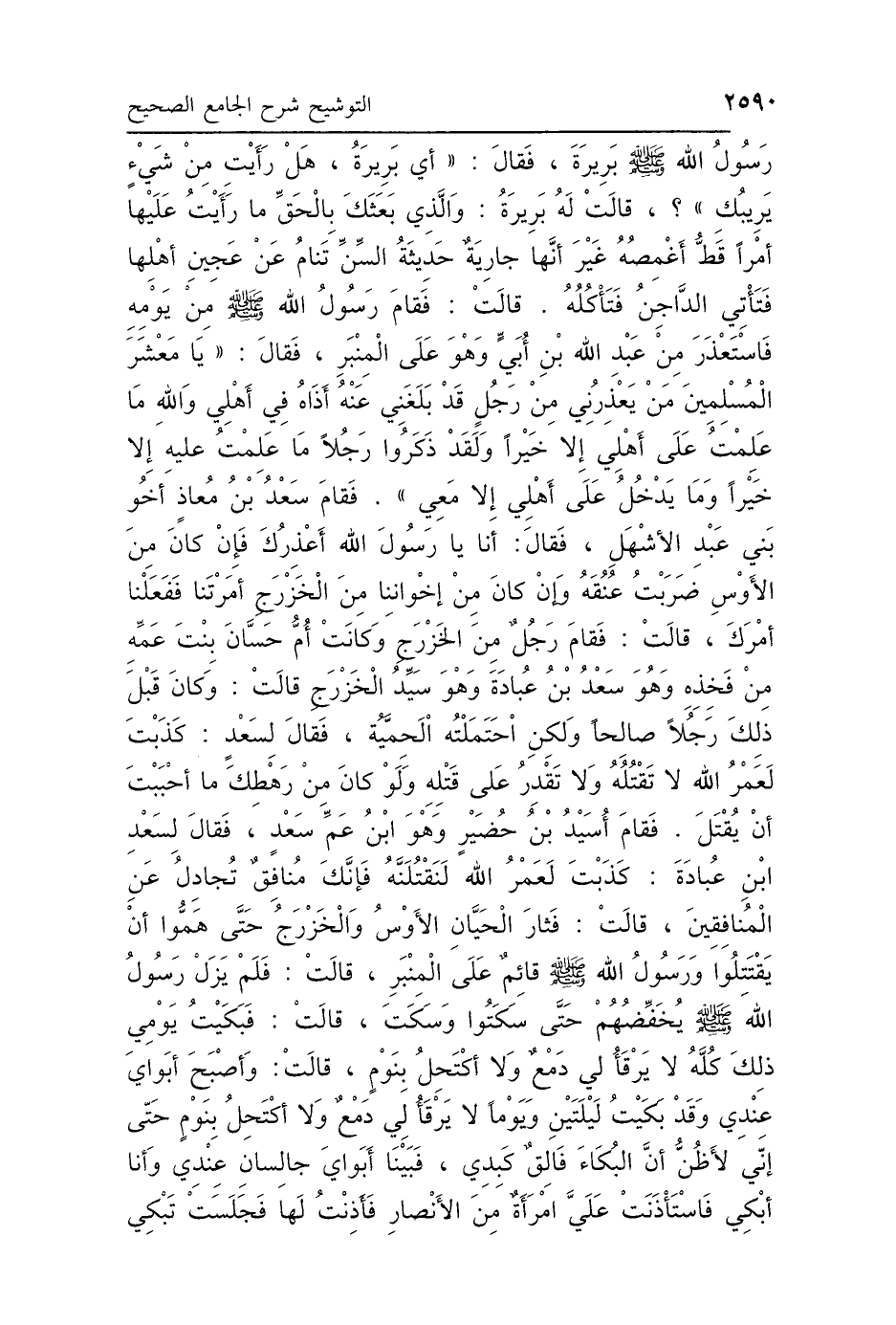 رَسُولُ اللَّهِ صَلَّى اللهُ عَلَيْهِ وَسَلَّمَ بَرِيرَةَ، فَقَالَ: «أَيْ بَرِيرَةُ، هَلْ رَأَيْتِ مِنْ شَيْءٍ يَرِيبُكِ؟». قَالَتْ لَهُ بَرِيرَةُ: وَالَّذِي بَعَثَكَ بِالحَقِّ، مَا رَأَيْتُ عَلَيْهَا أَمْرًا قَطُّ أَغْمِصُهُ غَيْرَ أَنَّهَا جَارِيَةٌ حَدِيثَةُ السِّنِّ، تَنَامُ عَنْ عَجِينِ أَهْلِهَا، فَتَأْتِي الدَّاجِنُ فَتَأْكُلُهُ، قَالَتْ: فَقَامَ رَسُولُ اللَّهِ صَلَّى اللهُ عَلَيْهِ وَسَلَّمَ مِنْ يَوْمِهِ فَاسْتَعْذَرَ مِنْ عَبْدِ اللَّهِ بْنِ أُبَيٍّ، وَهُوَ عَلَى المِنْبَرِ، فَقَالَ: «يَا مَعْشَرَ المُسْلِمِينَ، مَنْ يَعْذِرُنِي مِنْ رَجُلٍ قَدْ بَلَغَنِي عَنْهُ أَذَاهُ فِي أَهْلِي، وَاللَّهِ مَا عَلِمْتُ عَلَى أَهْلِي إِلَّا خَيْرًا، وَلَقَدْ ذَكَرُوا رَجُلًا مَا عَلِمْتُ عَلَيْهِ إِلَّا خَيْرًا، وَمَا يَدْخُلُ عَلَى أَهْلِي إِلَّا مَعِي». قَالَتْ: فَقَامَ سَعْدُ بْنُ مُعَاذٍ أَخُو بَنِي عَبْدِ الأَشْهَلِ، فَقَالَ: أَنَا يَا رَسُولَ اللَّهِ أَعْذِرُكَ، فَإِنْ كَانَ مِنَ الأَوْسِ ضَرَبْتُ عُنُقَهُ، وَإِنْ كَانَ مِنْ إِخْوَانِنَا مِنَ الخَزْرَجِ أَمَرْتَنَا فَفَعَلْنَا أَمْرَكَ، قَالَتْ: فَقَامَ رَجُلٌ مِنَ الخَزْرَجِ، وَكَانَتْ أُمُّ حَسَّانَ بِنْتَ عَمِّهِ مِنْ فَخِذِهِ، وَهُوَ سَعْدُ بْنُ عُبَادَةَ، وَهُوَ سَيِّدُ الخَزْرَجِ، قَالَتْ: وَكَانَ قَبْلَ ذَلِكَ رَجُلًا صَالِحًا، وَلَكِنِ احْتَمَلَتْهُ الحَمِيَّةُ، فَقَالَ لِسَعْدٍ: كَذَبْتَ لَعَمْرُ اللَّهِ لاَ تَقْتُلُهُ، وَلاَ تَقْدِرُ عَلَى قَتْلِهِ، وَلَوْ كَانَ مِنْ رَهْطِكَ مَا أَحْبَبْتَ أَنْ يُقْتَلَ. فَقَامَ أُسَيْدُ بْنُ حُضَيْرٍ، وَهُوَ ابْنُ عَمِّ سَعْدٍ، فَقَالَ لِسَعْدِ بْنِ عُبَادَةَ: كَذَبْتَ لَعَمْرُ اللَّهِ لَنَقْتُلَنَّهُ، فَإِنَّكَ مُنَافِقٌ تُجَادِلُ عَنِ المُنَافِقِينَ، قَالَتْ: فَثَارَ الحَيَّانِ الأَوْسُ، وَالخَزْرَجُ حَتَّى هَمُّوا أَنْ يَقْتَتِلُوا، وَرَسُولُ اللَّهِ صَلَّى اللهُ عَلَيْهِ وَسَلَّمَ قَائِمٌ عَلَى المِنْبَرِ، قَالَتْ: فَلَمْ يَزَلْ رَسُولُ اللَّهِ صَلَّى اللهُ عَلَيْهِ وَسَلَّمَ يُخَفِّضُهُمْ، حَتَّى سَكَتُوا وَسَكَتَ، قَالَتْ: فَبَكَيْتُ يَوْمِي ذَلِكَ كُلَّهُ لاَ يَرْقَأُ لِي دَمْعٌ وَلاَ أَكْتَحِلُ بِنَوْمٍ، قَالَتْ: وَأَصْبَحَ أَبَوَايَ عِنْدِي، وَقَدْ بَكَيْتُ لَيْلَتَيْنِ وَيَوْمًا، لاَ يَرْقَأُ لِي دَمْعٌ وَلاَ أَكْتَحِلُ بِنَوْمٍ، حَتَّى إِنِّي لَأَظُنُّ أَنَّ البُكَاءَ فَالِقٌ كَبِدِي، فَبَيْنَا أَبَوَايَ جَالِسَانِ عِنْدِي وَأَنَا أَبْكِي، فَاسْتَأْذَنَتْ عَلَيَّ امْرَأَةٌ مِنَ الأَنْصَارِ فَأَذِنْتُ لَهَا، فَجَلَسَتْ تَبْكِي