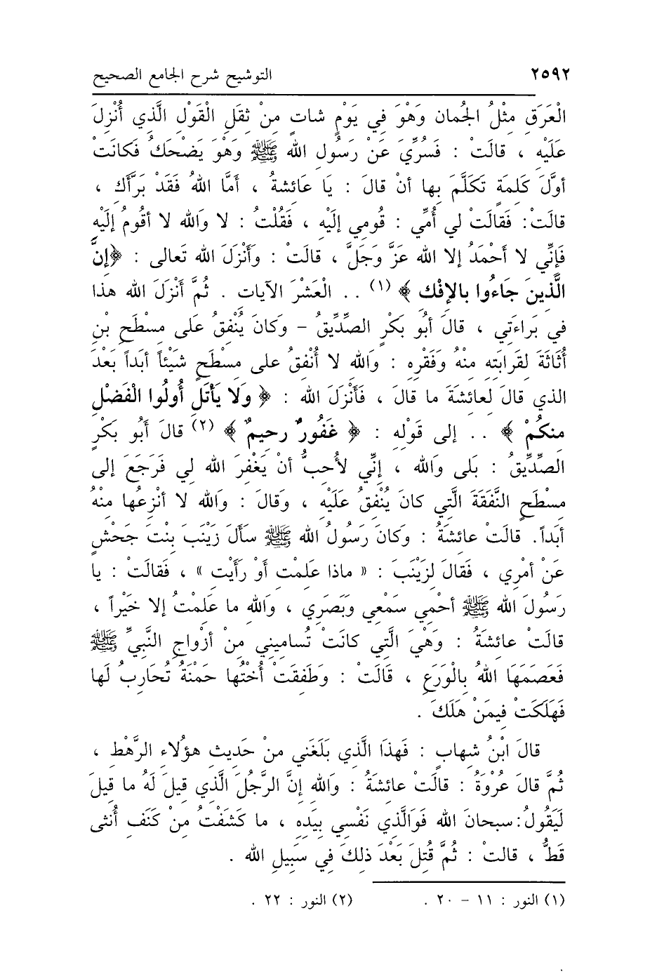 مِنَ العَرَقِ مِثْلُ الجُمَانِ، وَهُوَ فِي يَوْمٍ شَاتٍ مِنْ ثِقَلِ القَوْلِ الَّذِي أُنْزِلَ عَلَيْهِ، قَالَتْ: فَسُرِّيَ عَنْ رَسُولِ اللَّهِ صَلَّى اللهُ عَلَيْهِ وَسَلَّمَ وَهُوَ يَضْحَكُ، فَكَانَتْ أَوَّلَ كَلِمَةٍ تَكَلَّمَ بِهَا أَنْ قَالَ: «يَا عَائِشَةُ، أَمَّا اللَّهُ فَقَدْ بَرَّأَكِ». قَالَتْ: فَقَالَتْ لِي أُمِّي: قُومِي إِلَيْهِ، فَقُلْتُ: وَاللَّهِ لاَ أَقُومُ إِلَيْهِ، فَإِنِّي لاَ أَحْمَدُ إِلَّا اللَّهَ عَزَّ وَجَلَّ، قَالَتْ: وَأَنْزَلَ اللَّهُ تَعَالَى: {إِنَّ الَّذِينَ جَاءُوا بِالإِفْكِ عُصْبَةٌ مِنْكُمْ} العَشْرَ الآيَاتِ، ثُمَّ أَنْزَلَ اللَّهُ هَذَا فِي بَرَاءَتِي، قَالَ أَبُو بَكْرٍ الصِّدِّيقُ: وَكَانَ يُنْفِقُ عَلَى مِسْطَحِ بْنِ أُثَاثَةَ لِقَرَابَتِهِ مِنْهُ وَفَقْرِهِ: وَاللَّهِ لاَ أُنْفِقُ عَلَى مِسْطَحٍ شَيْئًا أَبَدًا، بَعْدَ الَّذِي قَالَ لِعَائِشَةَ مَا قَالَ، فَأَنْزَلَ اللَّهُ: {وَلاَ يَأْتَلِ أُولُو الفَضْلِ مِنْكُمْ} - إِلَى قَوْلِهِ - {غَفُورٌ رَحِيمٌ} [البقرة: 173]، قَالَ أَبُو بَكْرٍ الصِّدِّيقُ: بَلَى وَاللَّهِ إِنِّي لَأُحِبُّ أَنْ يَغْفِرَ اللَّهُ لِي، فَرَجَعَ إِلَى مِسْطَحٍ النَّفَقَةَ الَّتِي كَانَ يُنْفِقُ عَلَيْهِ، وَقَالَ: وَاللَّهِ لاَ أَنْزِعُهَا مِنْهُ أَبَدًا، قَالَتْ عَائِشَةُ: وَكَانَ رَسُولُ اللَّهِ صَلَّى اللهُ عَلَيْهِ وَسَلَّمَ سَأَلَ زَيْنَبَ بِنْتَ جَحْشٍ عَنْ أَمْرِي، فَقَالَ لِزَيْنَبَ: «مَاذَا عَلِمْتِ، أَوْ رَأَيْتِ». فَقَالَتْ: يَا رَسُولَ اللَّهِ أَحْمِي سَمْعِي وَبَصَرِي، وَاللَّهِ مَا عَلِمْتُ إِلَّا خَيْرًا، قَالَتْ عَائِشَةُ: وَهِيَ الَّتِي كَانَتْ تُسَامِينِي مِنْ أَزْوَاجِ النَّبِيِّ صَلَّى اللهُ عَلَيْهِ وَسَلَّمَ فَعَصَمَهَا اللَّهُ بِالوَرَعِ، قَالَتْ: وَطَفِقَتْ أُخْتُهَا حَمْنَةُ تُحَارِبُ لَهَا، فَهَلَكَتْ، فِيمَنْ هَلَكَ قَالَ ابْنُ شِهَابٍ: «فَهَذَا الَّذِي بَلَغَنِي مِنْ حَدِيثِ هَؤُلاَءِ الرَّهْطِ» ثُمَّ قَالَ عُرْوَةُ، قَالَتْ عَائِشَةُ: " وَاللَّهِ إِنَّ الرَّجُلَ الَّذِي قِيلَ لَهُ مَا قِيلَ لَيَقُولُ: سُبْحَانَ اللَّهِ، فَوَالَّذِي نَفْسِي بِيَدِهِ مَا كَشَفْتُ مِنْ كَنَفِ أُنْثَى قَطُّ، قَالَتْ: ثُمَّ قُتِلَ بَعْدَ ذَلِكَ فِي سَبِيلِ اللَّهِ".