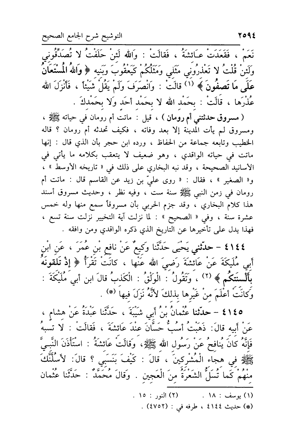 (مسروق حدثتني أم رومان)، قيل: ماتت أم رومان في حياته - صلى الله عليه وسلم -، ومسروق لم يأت المدينة إلا بعد وفاته، فكيف تحدثه أم رومان؟ قاله الخطيب وتابعه جماعة من الحفاظ، ورده ابن حجر بأن الذي قال: إنها ماتت في حياته الواقدي، وهو ضعيف لا يتعقب بكلامه ما يأتي في الأسانيد الصحيحة، وقد نبه البخاري على ذلك في "تاريخه الأوسط"، و "الصغير"، فقال: "روى عليّ بن زيد عن القاسم قال: ماتت أم رومان في زمن النبي - صلى الله عليه وسلم - سنة ست، وفيه نظر، وحديث مسروق أسند هذا كلام البخاري، وقد جزم الحربي بأن مسروقًا سمع منها وله خمس عشرة سنة، وفي "الصحيح": لما نزلت آية التخيير نزلت سنة تسع، فهذا يدل على تأخيرها عن التاريخ الذي ذكره الواقدي ومن وافقه.