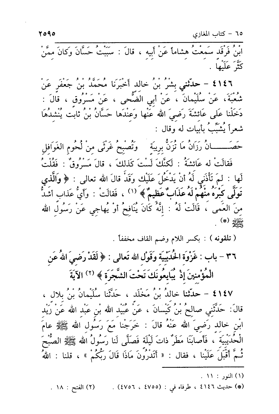 4146 - حَدَّثَنِي بِشْرُ بْنُ خَالِدٍ، أَخْبَرَنَا مُحَمَّدُ بْنُ جَعْفَرٍ، عَنْ شُعْبَةَ، عَنْ سُلَيْمَانَ، عَنْ أَبِي الضُّحَى، عَنْ مَسْرُوقٍ، قَالَ: دَخَلْنَا عَلَى عَائِشَةَ رَضِيَ اللَّهُ عَنْهَا، وَعِنْدَهَا حَسَّانُ بْنُ ثَابِتٍ يُنْشِدُهَا شِعْرًا، يُشَبِّبُ بِأَبْيَاتٍ لَهُ: وَقَالَ: