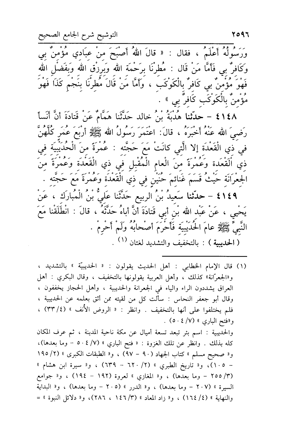 4148 - حَدَّثَنَا هُدْبَةُ بْنُ خَالِدٍ، حَدَّثَنَا هَمَّامٌ، عَنْ قَتَادَةَ، أَنَّ أَنَسًا رَضِيَ اللَّهُ عَنْهُ، أَخْبَرَهُ قَالَ: " اعْتَمَرَ رَسُولُ اللَّهِ صَلَّى اللهُ عَلَيْهِ وَسَلَّمَ أَرْبَعَ عُمَرٍ، كُلَّهُنَّ فِي ذِي القَعْدَةِ، إِلَّا الَّتِي كَانَتْ مَعَ حَجَّتِهِ: عُمْرَةً مِنَ الحُدَيْبِيَةِ فِي ذِي القَعْدَةِ، وَعُمْرَةً مِنَ العَامِ المُقْبِلِ فِي ذِي القَعْدَةِ، وَعُمْرَةً مِنَ الجِعْرَانَةِ، حَيْثُ قَسَمَ غَنَائِمَ حُنَيْنٍ فِي ذِي القَعْدَةِ، وَعُمْرَةً مَعَ حَجَّتِهِ".