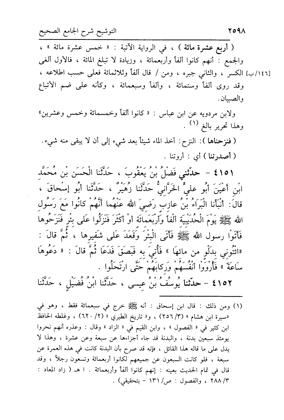 (أربع عشرة مائة)، في الرواية الآتية: "خمس عشرة مائة"، والجمع: أنهم كانوا ألفًا وأربعمائة، وزيادة لا تبلغ المائة، فالأول ألغى الكسر، والثاني جبره، ومن قال ألفًا وثلاثمائة فعلى حسب اطلاعه، وقد روى ألفًا وستمائة، وألفًا وسبعمائة، وكأنه على ضم الأتباع والصبيان.